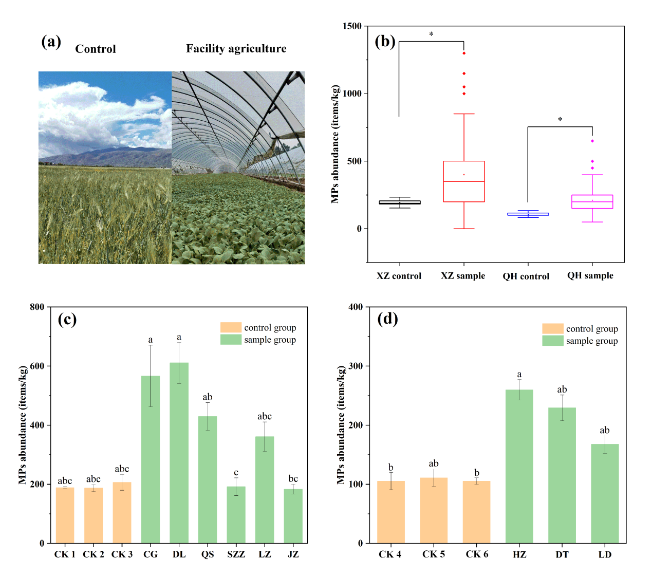 图1 (a) 研究地点的代表性景观图。(b)西藏(XZ)和青海(QH)对照组(露天邻近农田)和试验组(设施农田)土壤中微塑料的丰度分布。
