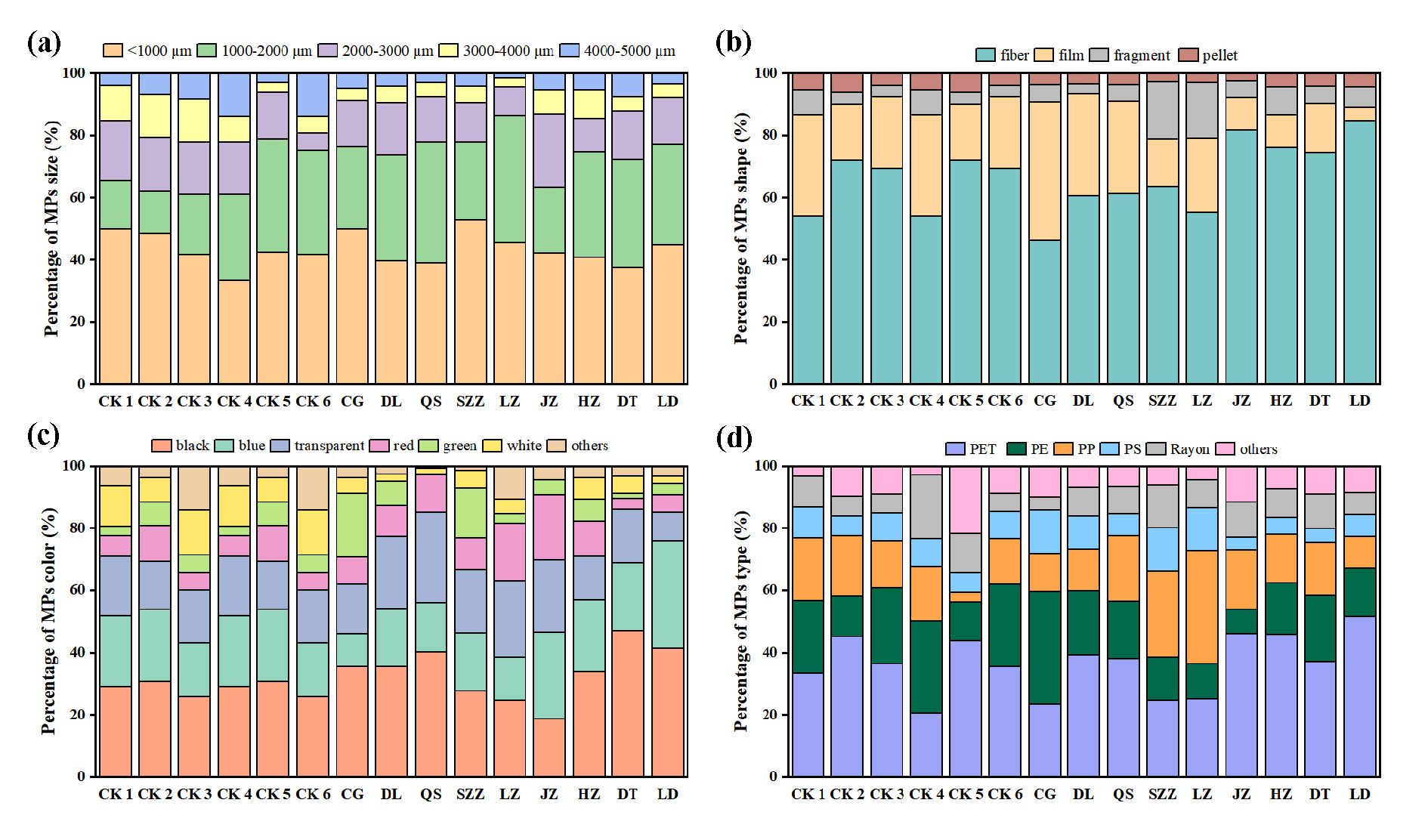 图2 青藏高原地区各采样点土壤中微塑料的尺寸(a)、形状(b)、颜色(c)和类型(d)。