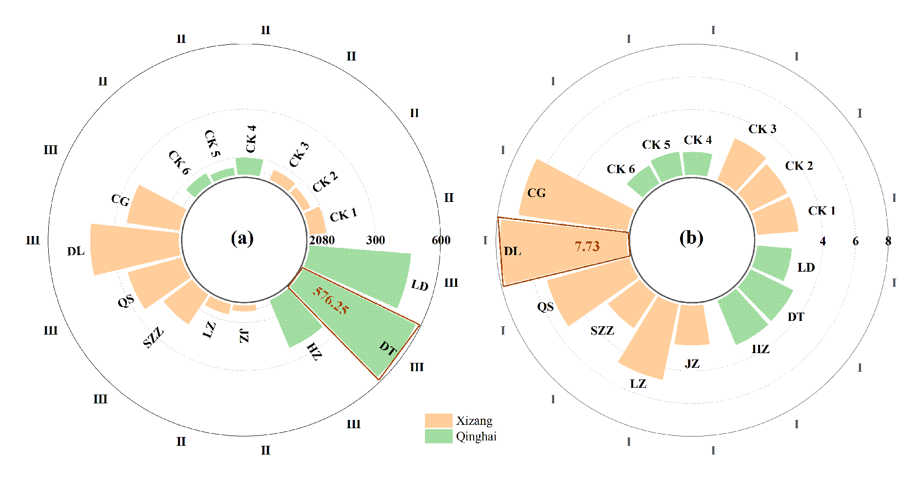 图3 青藏高原地区各采样点的聚合物风险指数PHI (a)和污染负荷指数PLI (b)生态风险。