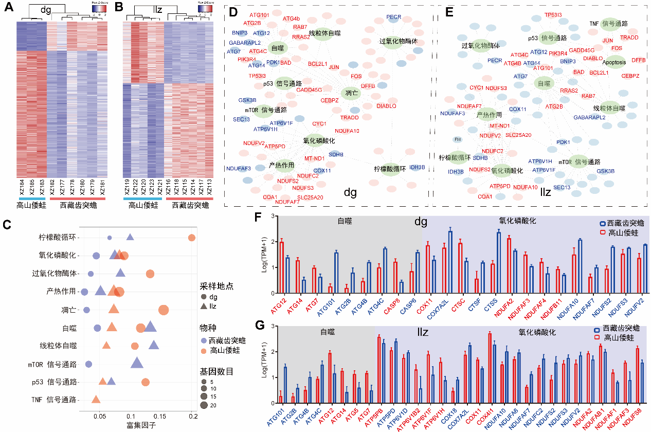 图3高山倭蛙和西藏齿突蟾基因表达的差异与功能趋同。(A–B) 高山倭蛙和西藏齿突蟾在采样点dg (A)和llz (B)的差异表达基因的表达模式。(C) 高山倭蛙和西藏齿突蟾差异表达基因的功能富集分析。圆形和三角形分别表示采样点 dg 和 llz;红色和蓝色填充分别表示在高山倭蛙和西藏齿突蟾中上调表达的基因。(D–E) 高山倭蛙和西藏齿突蟾的差异表达基因与功能富集项在采样点 dg (D) 和 llz (E) 的相关性。红色和蓝色圆圈分别表示高山倭蛙和西藏齿突蟾的上调基因;绿色圆圈表示富集功能项;红色和蓝色文字分别表示高山倭蛙和西藏齿突蟾在采样点 dg 和 llz 表达模式相似的上调基因。(F–G) 高山倭蛙和西藏齿突蟾在采样点 dg (F) 和 llz (G) 与自噬及氧化磷酸化相关的差异表达基因及其功能富集项。红色和蓝色条形分别代表高山倭蛙和西藏齿突蟾;红色和蓝色文字表示两物种中上调表达的基因。