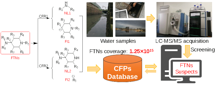 1.数据库构建:收集了已知及潜在的FTNs结构,并通过分子生成AI模型MolGPT,预测了大量可能的未知结构,进一步扩展了数据库的覆盖范围,最终获得了数十万种可能的FTNs。通过分析这些FTNS的取代模式和特征碎片路线,构建了一个包含特征碎裂产物(Characteristic Fragmentation Products, CFPs)的数据库。