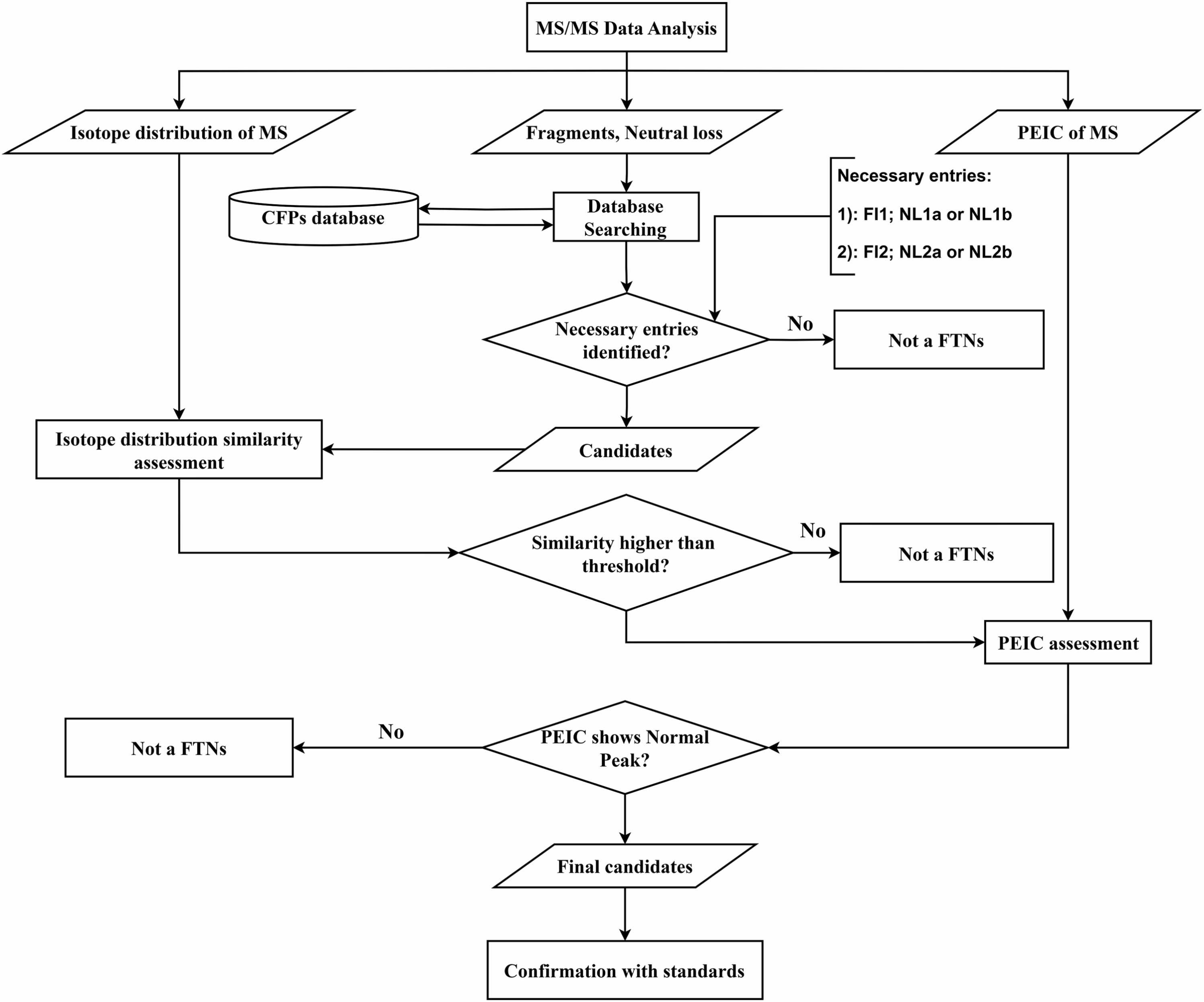 2.筛查策略:首先通过数据库匹配测得的特征性碎片,初步筛查潜在的FTNs候选物,此后结合同位素分布相似性和色谱峰特征,进一步验证候选物为FTNs的可能性。同时研究团队开发了FTNs_Finder程序,实现了特征碎片的预测、数据库匹配及同位素分布分析的自动化,大幅提升了筛查效率。