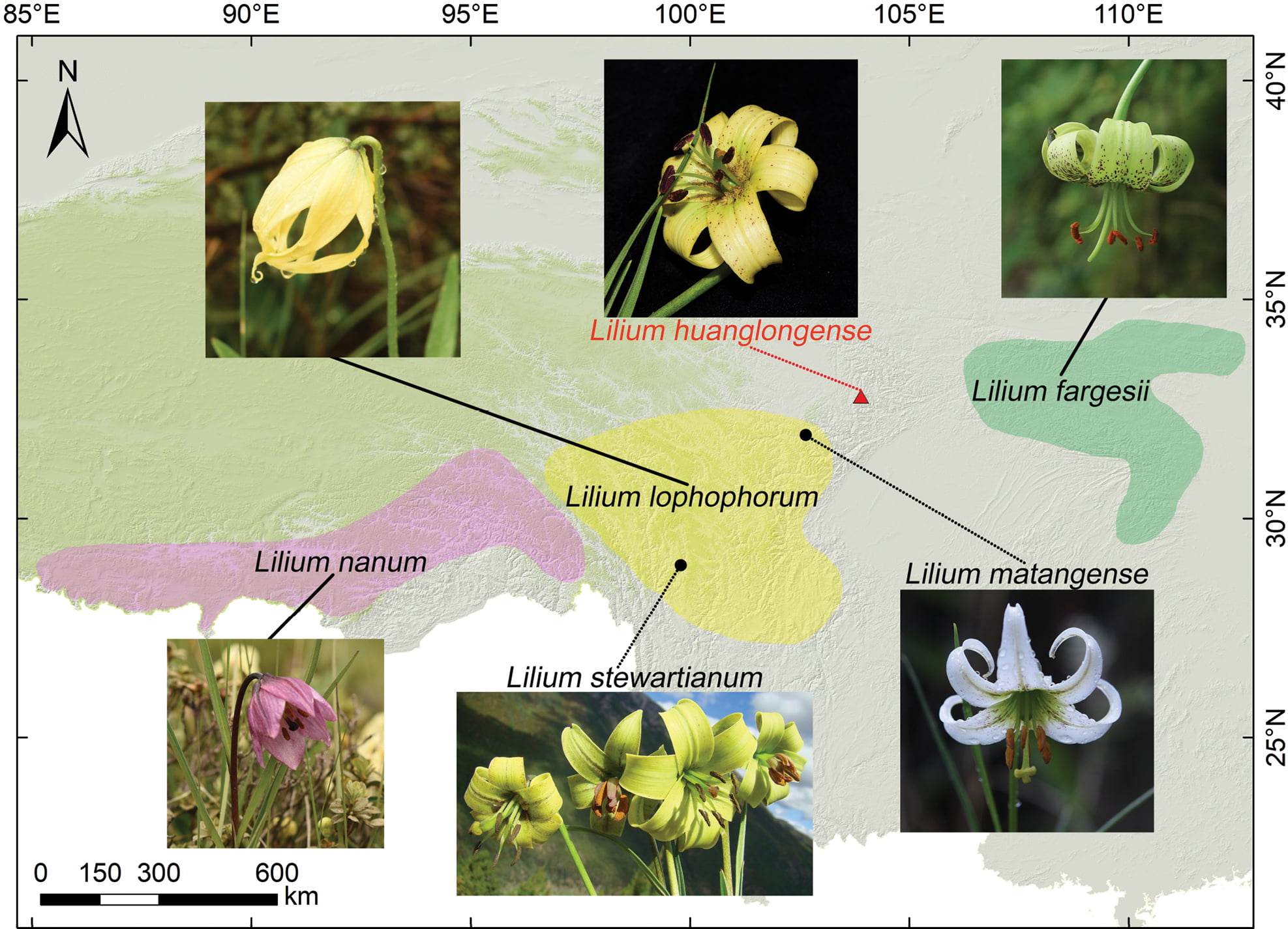 图1?黄龙百合(Lilium huanglongense)及相关物种的形态特征与地理分布。黄龙百合(L. huanglongense)填补了秦岭以西及横断山脉交汇处的地理空白。