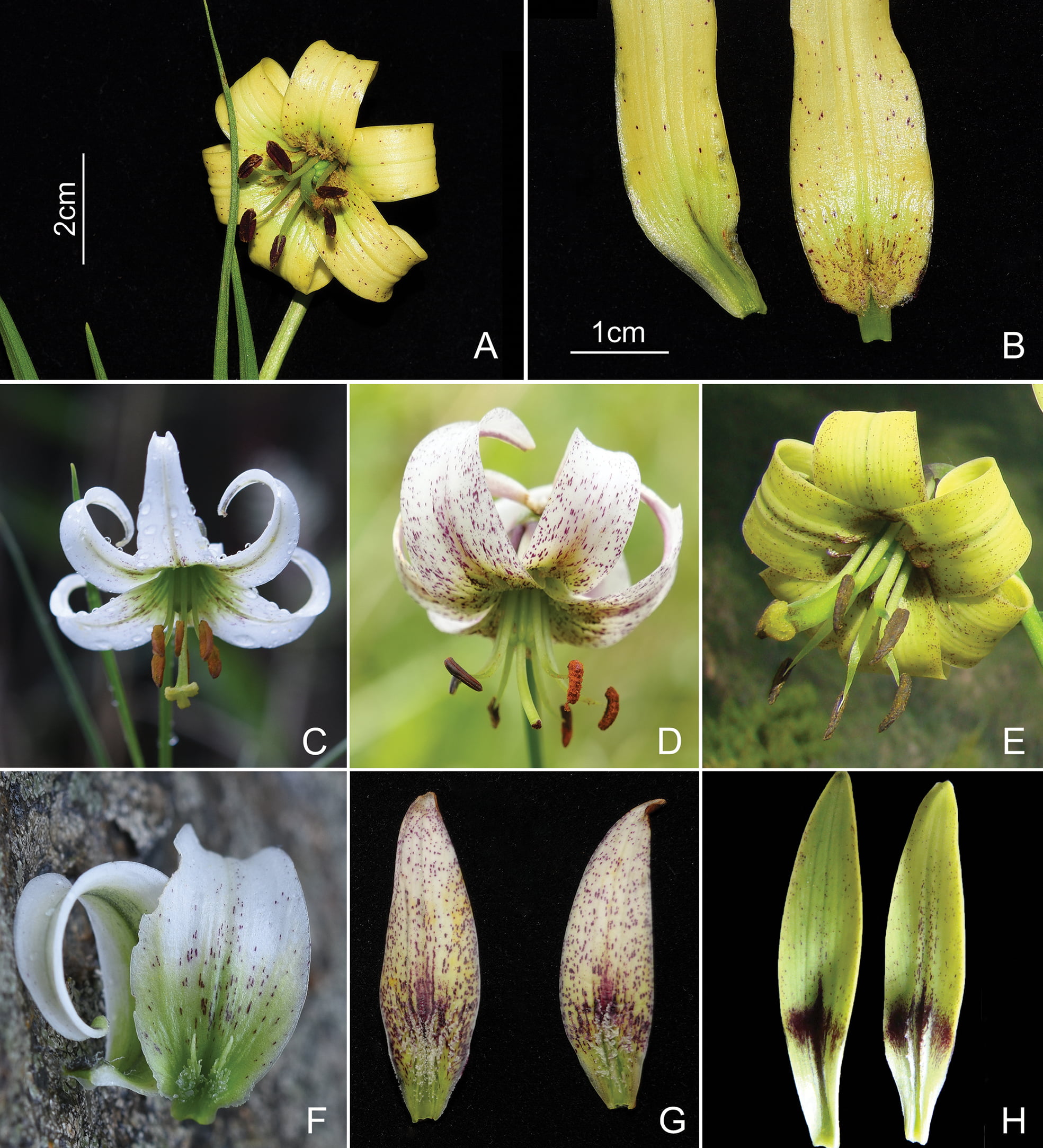 图2?相似物种花部结构比较:A. 黄龙百合(Lilium huanglongense)花;B. 黄龙百合(L. huanglongense)带基部蜜腺的花被片;C. 马塘百合(L. matangense)花;D. 绿花百合(L. fargesii)花;E. 单花百合(L. stewartianum)花;F. 马塘百合(L. matangense)带基部蜜腺的花被片;G. 绿花百合(L. fargesii)带基部蜜腺的花被片;H. 单花百合(L. stewartianum)带基部蜜腺的花被片。摄影:高云东。