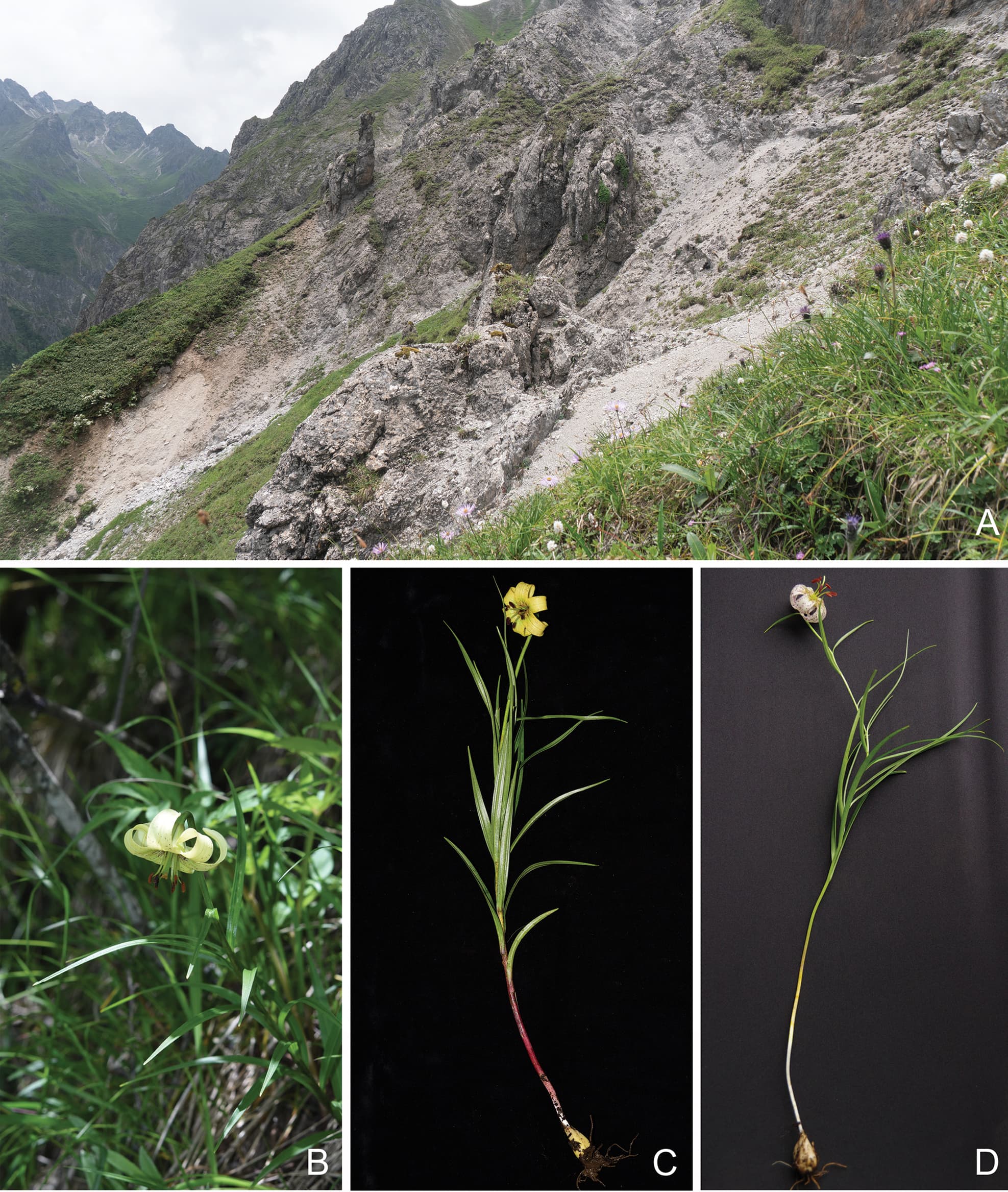 图3?黄龙百合(Lilium huanglongense)的生境和黄龙百合(L. huanglongense)与绿花百合(L. fargesii)的形态比较。A. 被泥石流破坏的生境;B. 开花植株;C. 黄龙百合(L. huanglongense)的形态特征,表现出较多的基部叶片,并且叶片比绿花百合(L. fargesii)更宽;D. 绿花百合(L. fargesii)的形态。以上照片由本文多位作者拍摄。