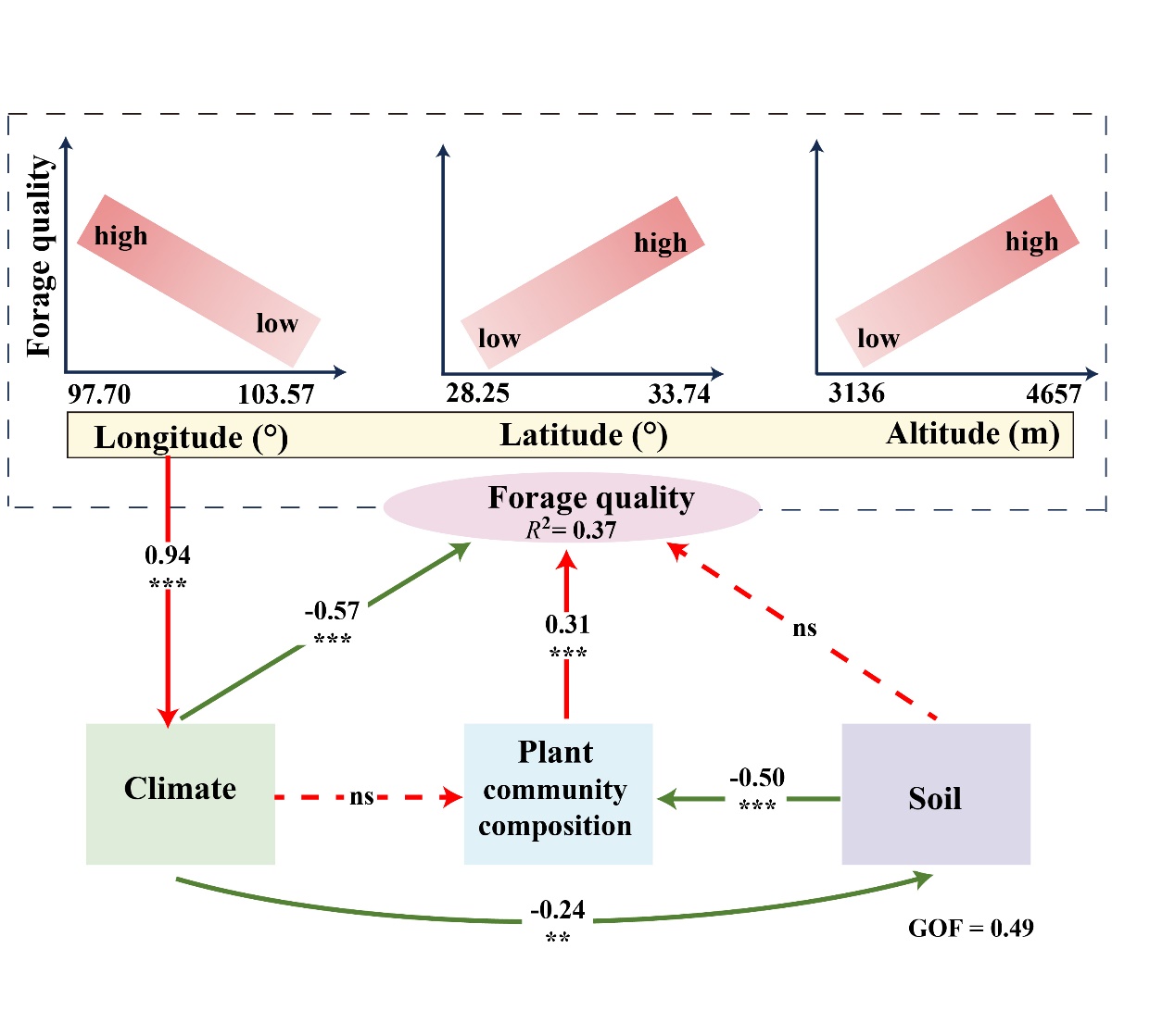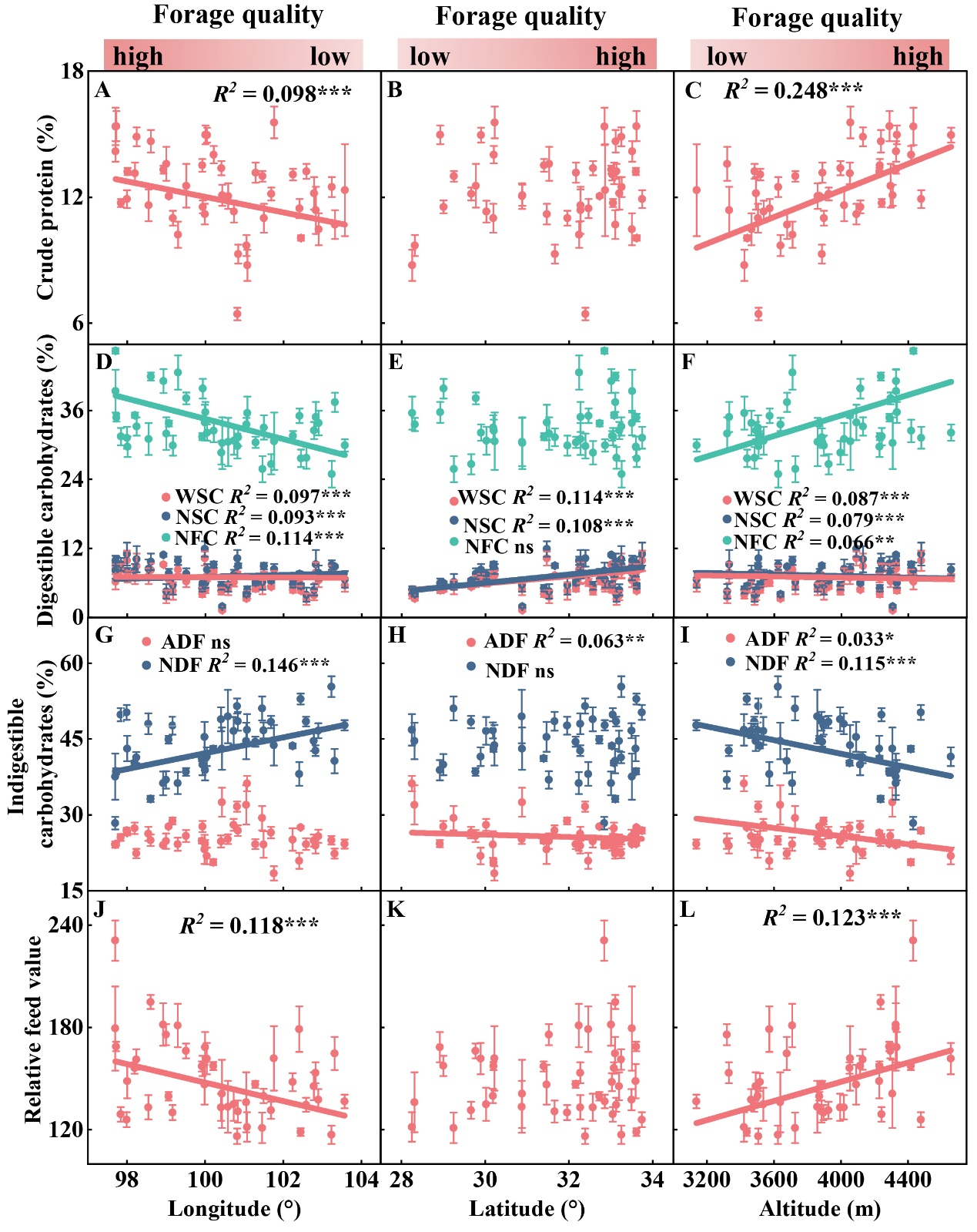 基于此,中国科学院成都生物研究所抗逆植物适应与筛选研究团队以该区代表性天然高寒草地(图1)为研究对象,在前期针对该区牧草产量评估的基础上,系统阐明了群落水平上牧草品质、品质储量的变异,并进一步揭示了其影响因素。研究表明:(1)该区天然牧草粗蛋白、非纤维碳水化合物含量和相对饲喂价值较高,但脂肪含量较低。(2)牧草品质存在明显的地理变异(图2):随经度的升高而下降(图3);随着纬度和海拔的升高而上升。(3)牧草品质的空间格局主要由气候因素驱动,更寒冷、更干燥且变异性更大的气候导致更高的牧草品质。
