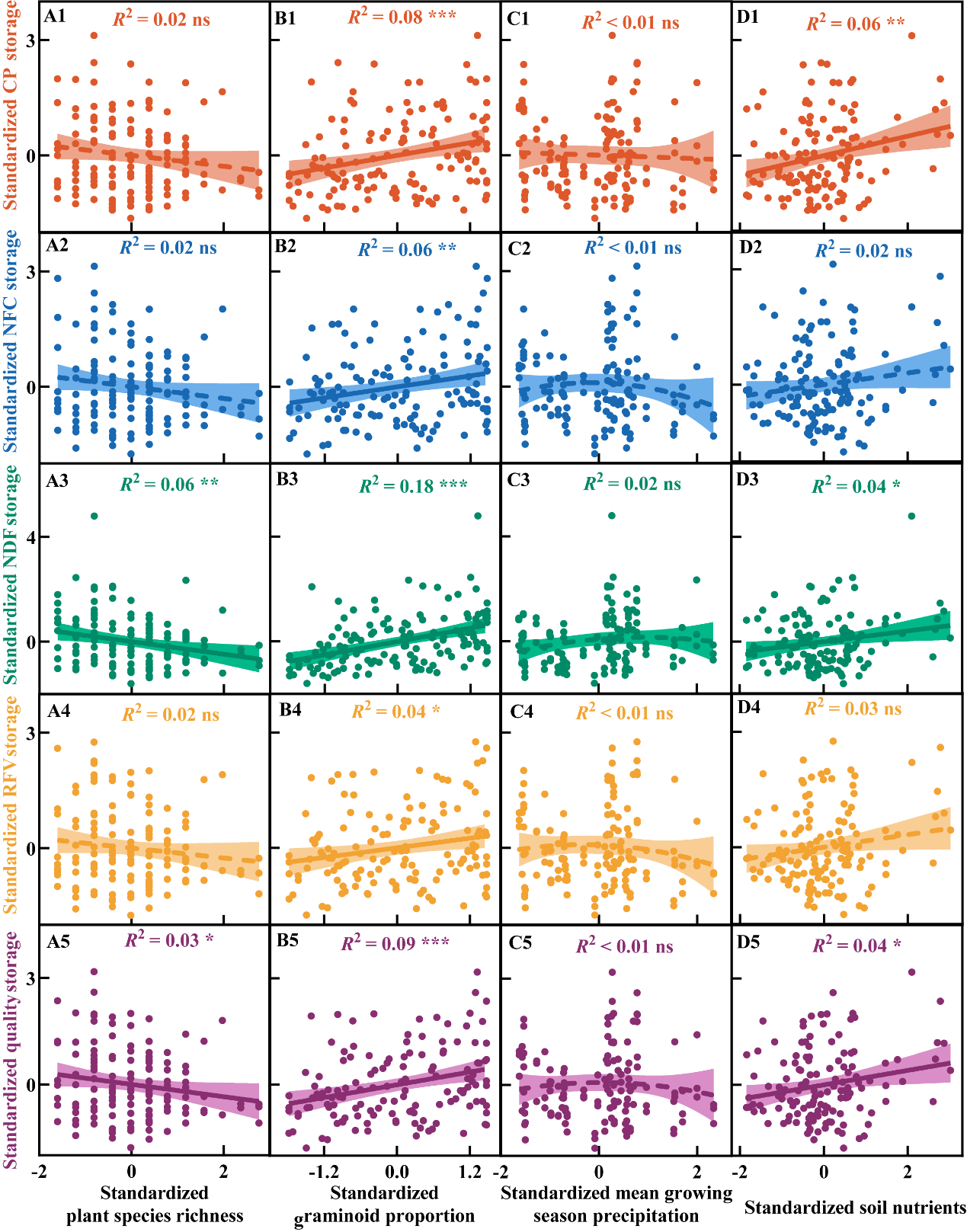 图3. 气候、群落组成及土壤特征对牧草品质地理变异的影响