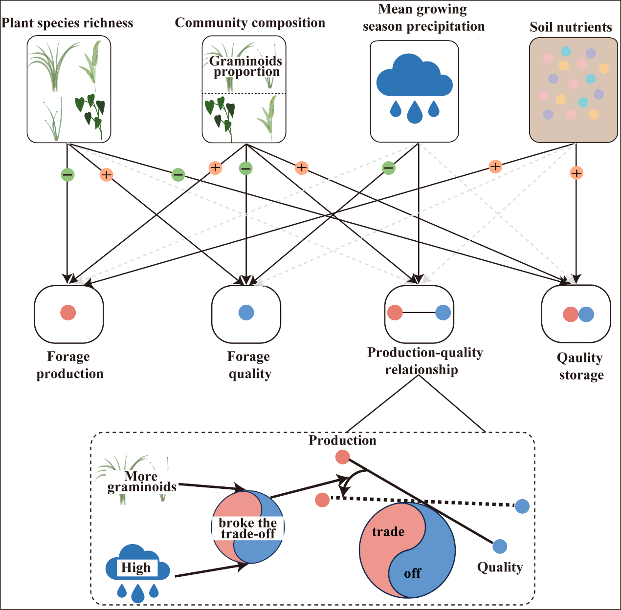 图4. 群落特征和环境因素对牧草产量和品质关系的影响