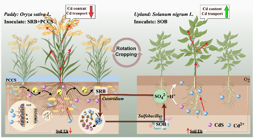 镉(Cd)污染稻田土壤已成为威胁粮食安全和公众健康的全球性环境问题。据统计,我国耕地土壤镉点位超标率高达7.0%,引发多起“镉大米”事件。传统钝化修复技术虽能降低镉的生物有效性,但无法彻底清除土壤中的总镉,且存在二次污染风险。针对这一难题,本研究团队提出了一种基于硫酸盐还原菌(SRB)和硫氧化菌(SOB)协同作用的“水稻-龙葵”轮作体系,实现了稻米安全生产与土壤镉去除的双重目标,为中国长江流域及全球水旱轮作区镉污染农田修复提供创新解决方案(图1)。