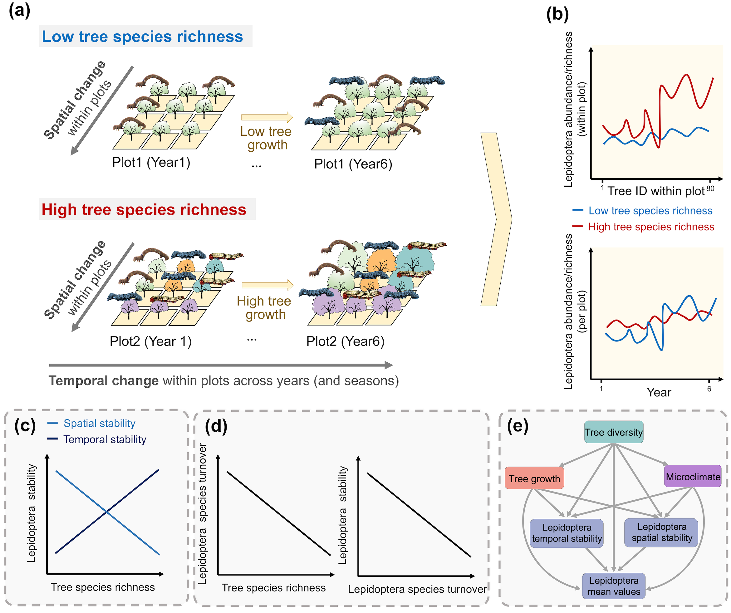 森林生态系统正面临日益加剧的环境变化压力,导致生物多样性下降,并增加了发生生物干扰的风险。虽然已有研究强调在探讨生物多样性丧失后果时应关注生态系统功能的时空维度,但大多集中在植物层面。而事实上,更高营养级的群落不仅在维持生物多样性与生态系统功能关系中发挥关键作用,同时也是森林中频繁发生的生物干扰事件的重要驱动因素。因此,深入解析植食性昆虫群落稳定性的驱动机制,不仅是理解森林生态学规律的核心科学问题,也是应对森林管理挑战的现实需求。