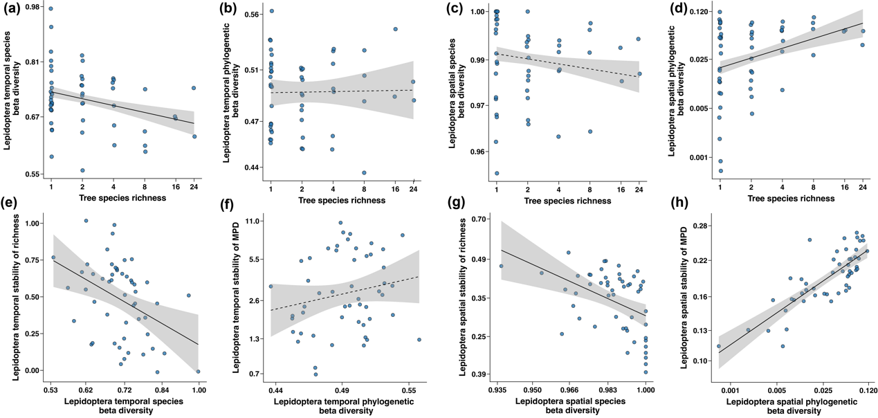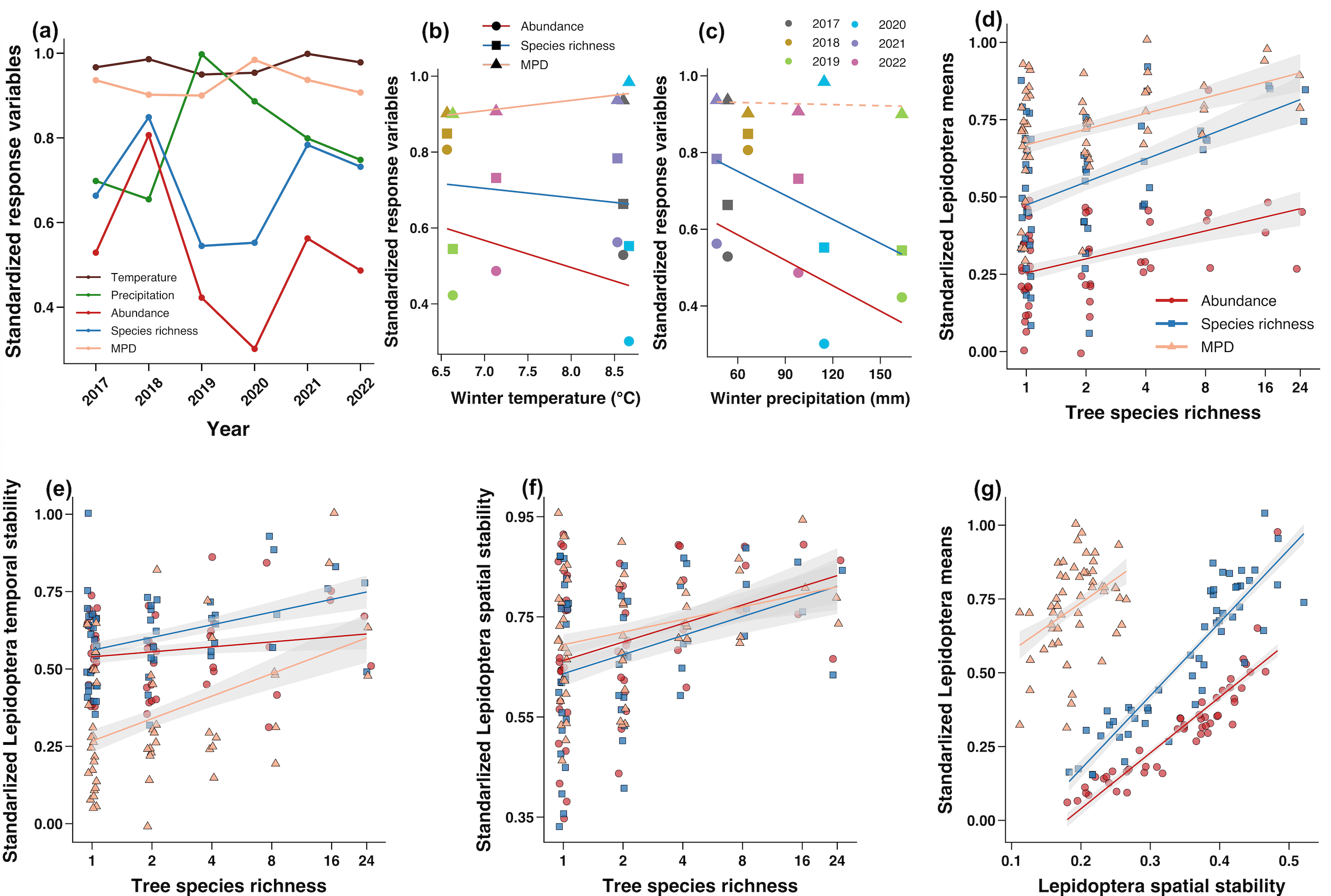 2.?树种丰富度与鳞翅目幼虫的平均多度、物种丰富度、MPD以及其时间和空间稳定性均呈正向关联(图2d–g)。
