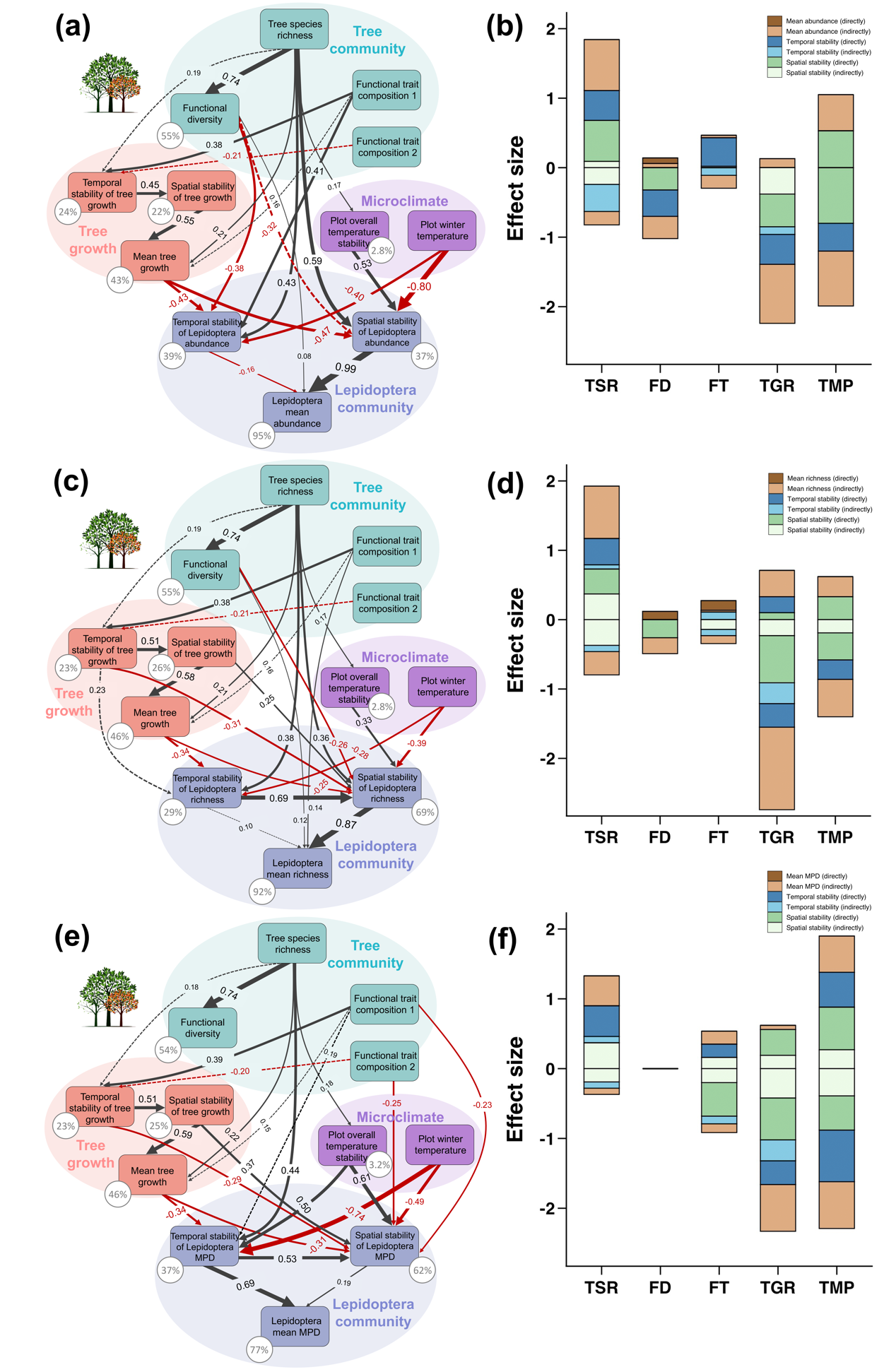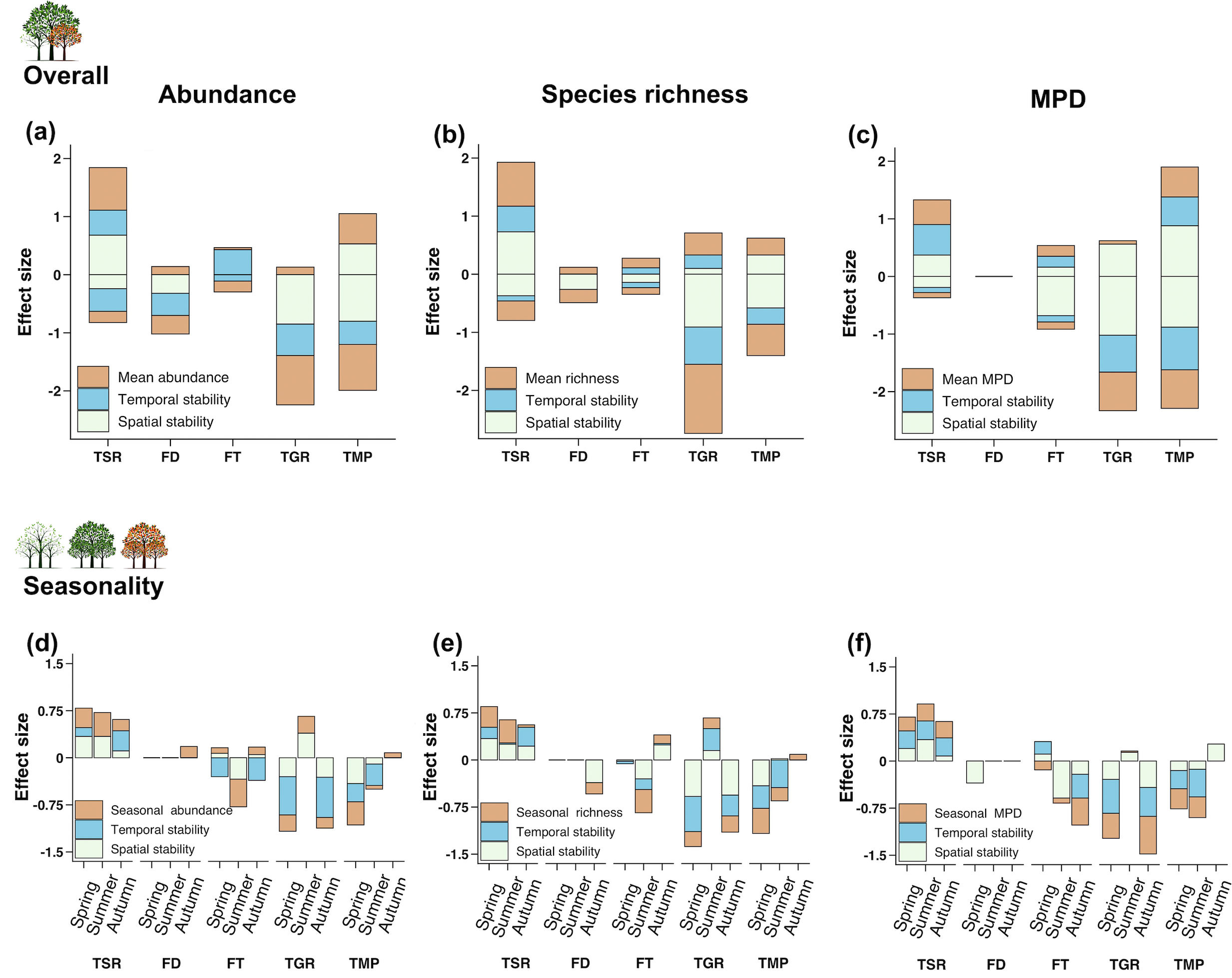 4.?不同因素对群落指标的影响存在差异:多度受树种丰富度和空间稳定性影响最强,其次为气候和树木生长动态;MPD受时间稳定性和冬季温度影响最显著;而物种丰富度的影响则较为平均分布于各因子(图4a–c)。总体而言,树种丰富度在各季节均表现出稳定正向作用,而其他变量如功能多样性、生长动态和微气候的效应方向与强度随季节变化(春秋负效应较强,夏季较弱或不显著)。此外,微气候温度对幼虫群落的影响从春季至秋季逐渐减弱(图4d–f)。