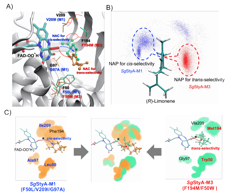 为进一步阐明立体选择性调控的分子机制,研究团队开展了分子动力学模拟。结果显示,第50位残基的大小直接影响底物的接近程度,而第194和第209位残基通过空间位阻协同调控底物的结合取向。在SgStyA-M1中,较小的Leu50允许底物更接近,配合较大的Phe194和Ile209引导底物形成有利于顺式环氧化的构象;而在SgStyA-M3中,体积较大的Trp50阻止底物过度接近,较小的Met194和Val209为底物提供足够空间,形成有利于反式环氧化的构象(图4)。