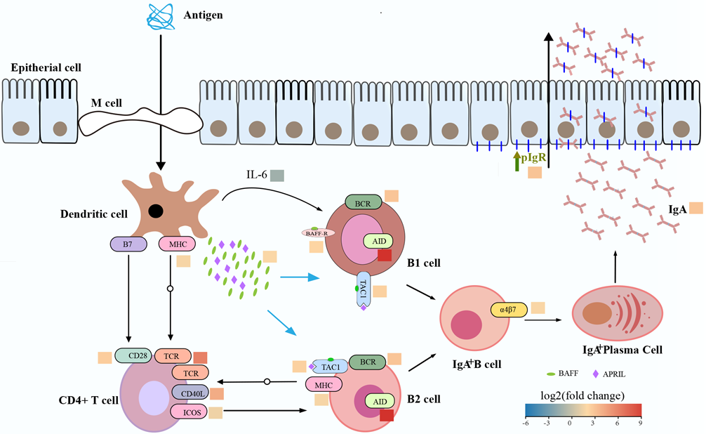 图3?浮萍疫苗组slgA粘膜免疫通路主要基因的表达上调,包括从lgA产生到分泌sIgA到黏膜