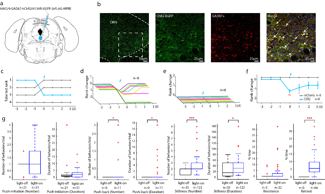 图2. 光遗传激活DRN GABA能神经元导致小鼠社会等级下降