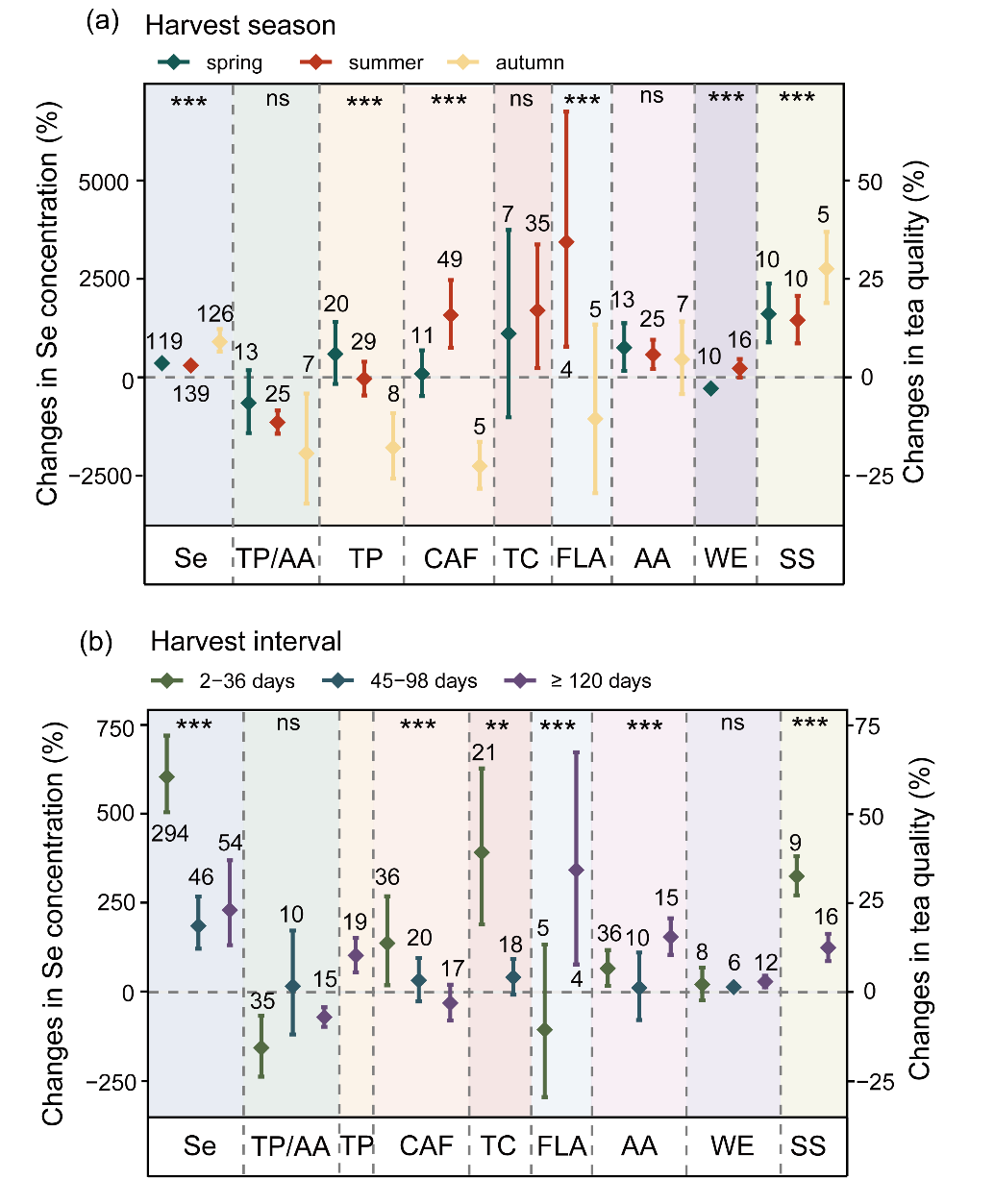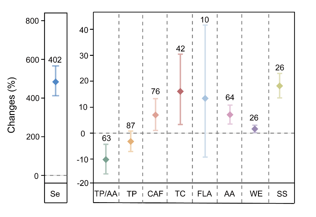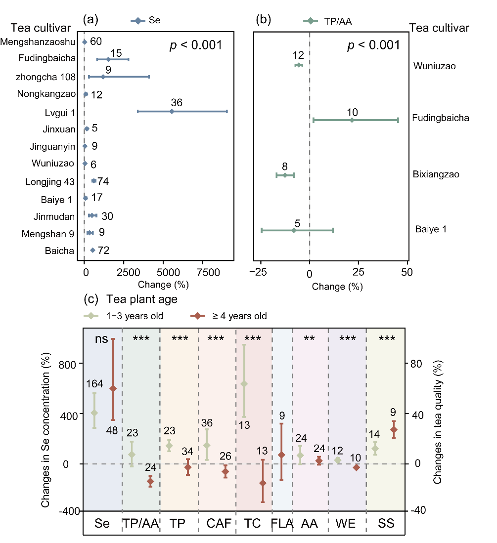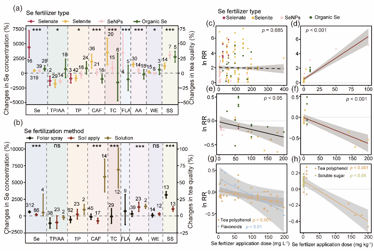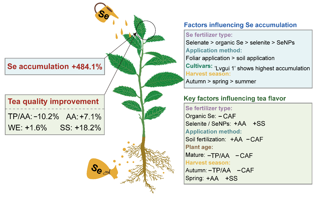 硒缺乏已成为影响农业系统与人类健康的全球性问题。茶树对硒具有强富集能力,其衍生的富硒茶是改善人群硒摄入的有效途径。然而,硒肥对茶叶品质成分的影响尚存争议。基于此,中国科学院成都生物研究所抗逆植物适应与筛选研究团队在尹春英研究员的指导下,博士研究生李柳系统整合中国38项研究的797组数据,采用Meta分析方法,深入解析了硒肥施用措施、茶树品种特性及采收时期等对茶叶硒积累与关键品质成分的影响及调控机制。