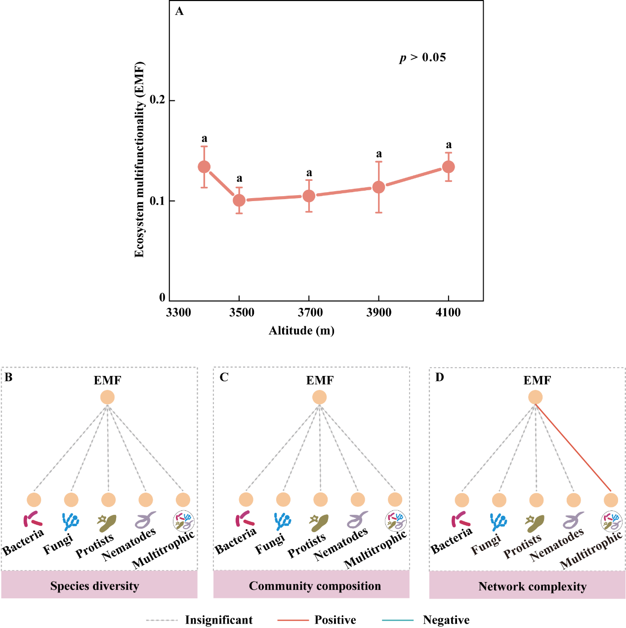 基于此,中国科学院成都生物研究所抗逆植物适应与筛选研究团队以该区高寒草甸为研究对象,在3400-4100 m海拔梯度范围采集土壤样品,通过高通量测序技术分析土壤中的细菌、真菌、原生生物和线虫群落。同时,评估土壤多营养级的物种多样性、群落组成和网络复杂性,并基于土壤养分状况、微生物生物量和草地生物量等18项功能指标构建了生态系统多功能性;结合土壤和气候环境参数,解析了不同营养级特征与EMF的关系及其潜在机制。研究表明:(1)随着海拔的升高,尽管多营养级物种多样性保持稳定,多营养级群落组成差异性显著降低,但其网络复杂性显著增加。(2)较单一营养类群特征,多营养级特征与EMF之间更为紧密的关联仅体现在网络复杂性层面,而非传统生物多样性维度。(3)环境因子(如低温和高土壤湿度)通过促进关键生物类群(如细菌与真菌)之间的协同作用,显著增强了多营养级网络复杂性,从而对EMF产生积极影响。这些结果不仅深化了对土壤生物多样性与生态系统多功能性关系的理解,也为高寒草地的保护与管理提供了理论依据。