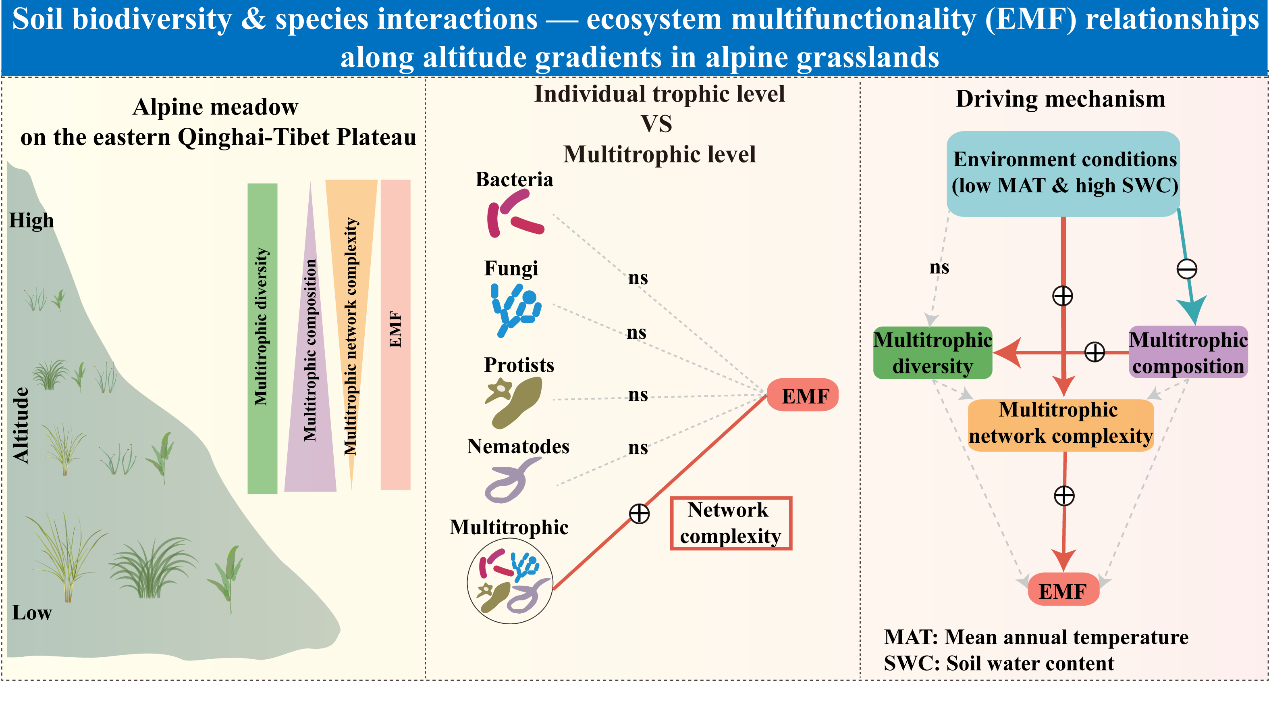 随着全球变化加剧,生物多样性丧失对生态系统功能的影响日益受到关注。土壤生物多样性在维持生态系统多功能性(EMF)中扮演关键角色。然而,以往研究多集中于有限营养级或简单的物种多样性指标,低估了土壤多营养级特征及其生物相互作用对EMF的贡献,尤其是在环境异质性高、生态系统脆弱的青藏高原高寒草地。