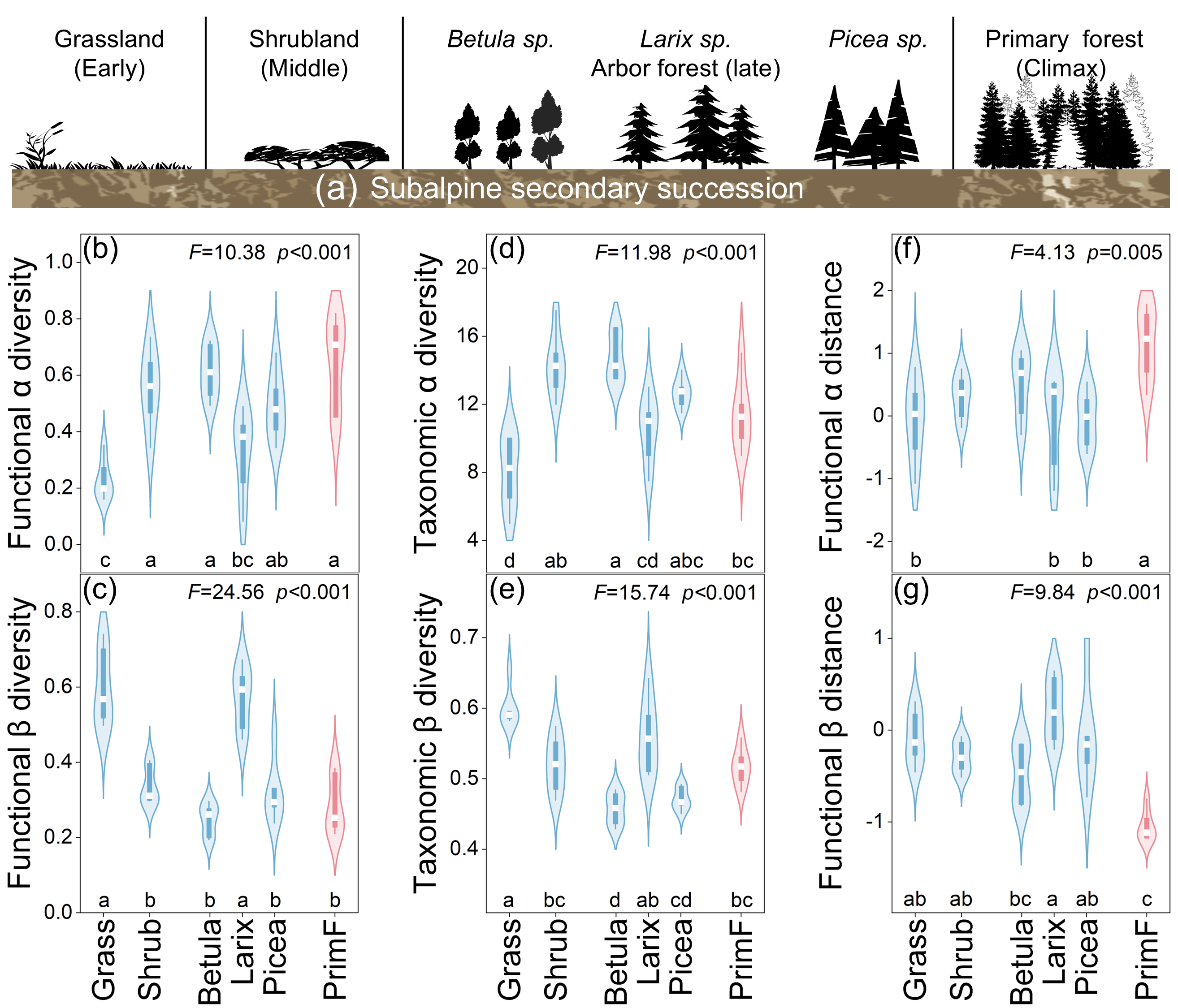 图1 高海拔次生演替过程中土壤无脊椎动物的功能α和β多样性(b-c)、分类学α和β多样性(d-e)以及标准化功能α和β距离(f-g)