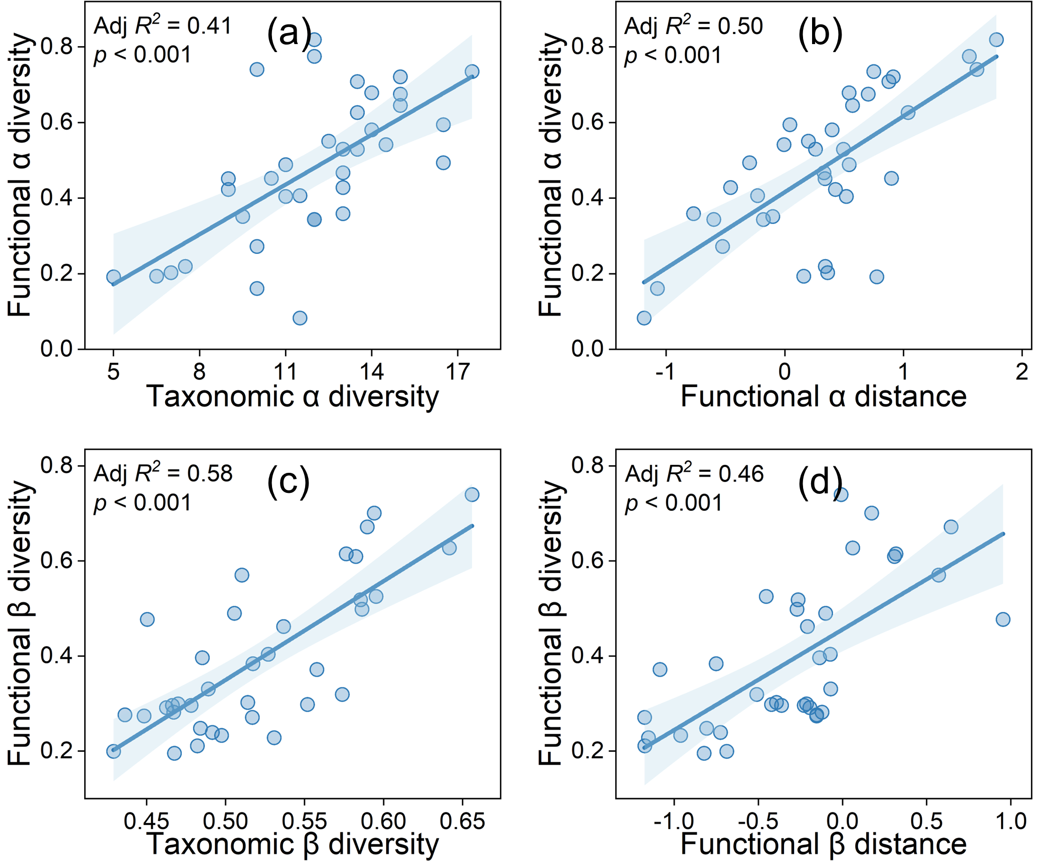 图2 分类多样性与功能多样性的关系(a、c),以及标准化功能距离与功能多样性的关系(b、d)