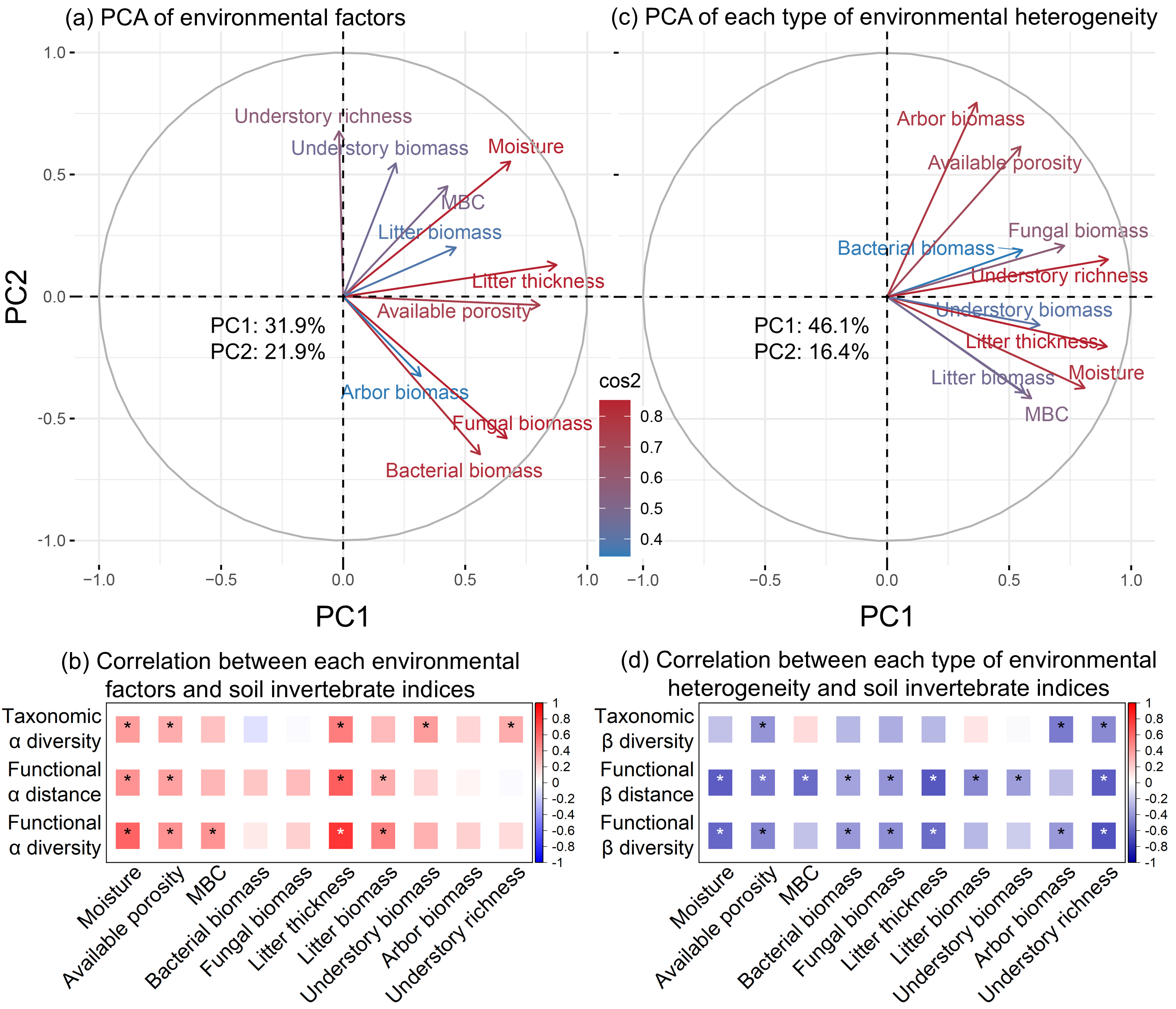 图3 环境因子(a)和环境异质性(c)的主成分分析?;肪骋蜃佑胪寥牢藜棺刀铴林副甑墓叵担╞)?;肪骋熘市杂胪寥牢藜棺刀铴轮副甑墓叵担╠)