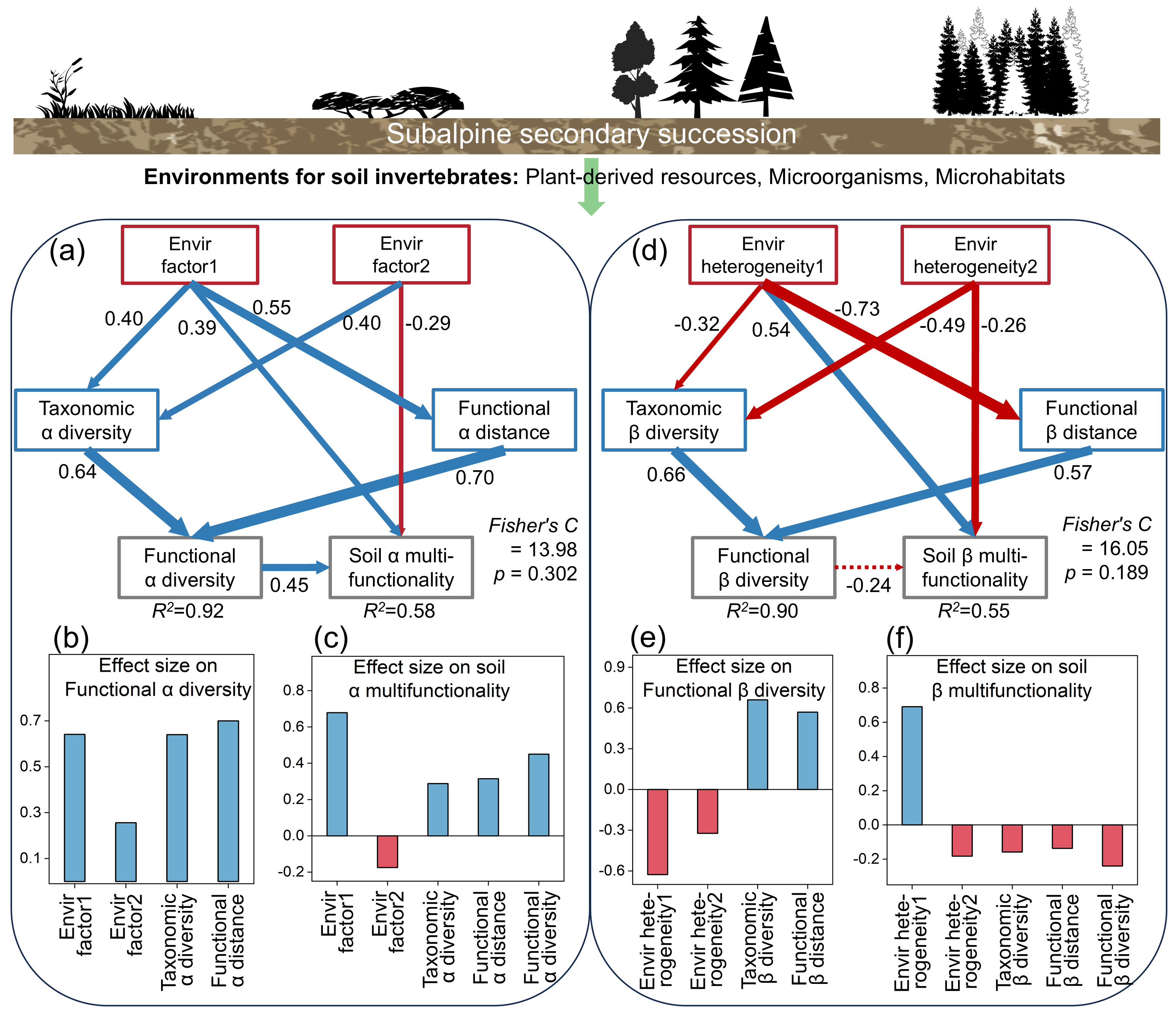 针对这一科学问题,中国科学院成都生物研究所退化土壤生态功能恢复创新团队博士生涂程伟在庞学勇研究员指导下,提出了一种新颖的“分类多样性-功能距离”分析方法,利用分类学多样性与分类群之间的功能距离共同解释功能多样性。该方法被应用于研究高海拔次生演替梯度(包括草地、灌丛、乔木林和原始林)上的土壤无脊椎动物群落。研究结果表明:(1)土壤无脊椎动物的功能α多样性(样地内的功能丰富度)总体上随演替增加,尽管在乔木林阶段因树种不同而有所波动;功能β多样性(样地间的功能不相似性)在演替过程中下降,支持趋同演替模型。(2)分类学α/β多样性(分类丰富度/不相似性)与标准化功能α/β距离(样地内/间的性状分化)共同塑造了观测到的功能α/β多样性,且两者的贡献相当。(3)凋落物和土壤微生境通过调控分类学多样性和标准化功能距离,影响土壤无脊椎动物的功能多样性,并最终支持土壤多功能性的演替恢复。