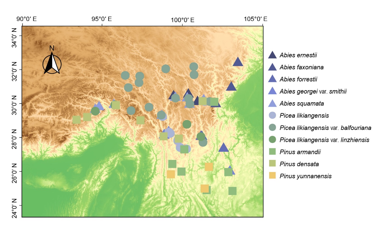 图1:青藏高原亚高山森林中11种松科植物采样点分布