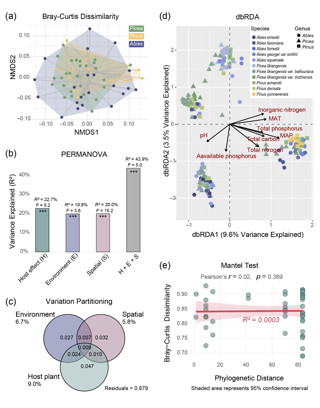 基于此,本研究以青藏高原亚高山森林的11种松科植物(云杉属、冷杉属、松属)为对象,对其195个单优林分的EcM真菌群落进行系统分析(图1),主要发现如下:(1)松科树种与EcM真菌的共生模式呈现高多样性(图2)与低专一性(图3),反映松科-EcM的泛化共生策略;(2)EcM群落结构主要受宿主特性、环境因子和空间距离驱动(图4),表明生态过程在局域组装中占主导;(3)研究区三大优势类群—蜡壳菌属、红菇属与丝盖伞属在全球系统发育树中未形成单系分支(图5),表明松科与核心EcM真菌的共生关系具有跨地理区系的进化保守性。本研究首次在青藏高原区域尺度上系统揭示了松科植物-EcM真菌群落的构建机制,明确了进化发育保守性与环境过滤在驱动菌根共生组合中的协同作用,深化了对高寒森林植物-微生物互作理论与群落构建机制的理解。