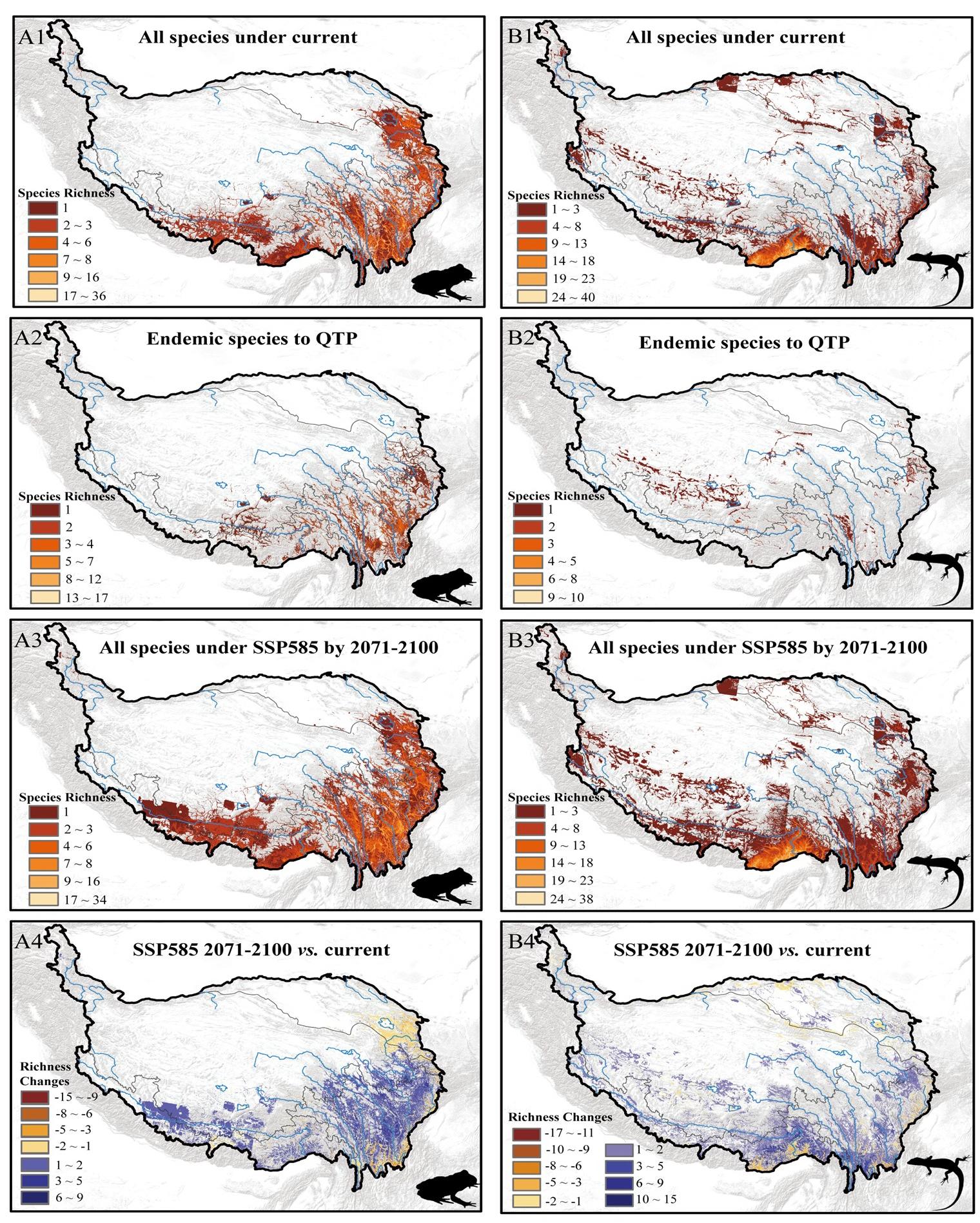 图2. 物种丰富度的地理分布与变化:两栖动物(A)与爬行动物(B)。(1)当前气候条件下所有物种;(2)青藏高原特有种;(3)SSP585气候情景下2071–2100年所有物种;(4)物种丰富度变化情况。