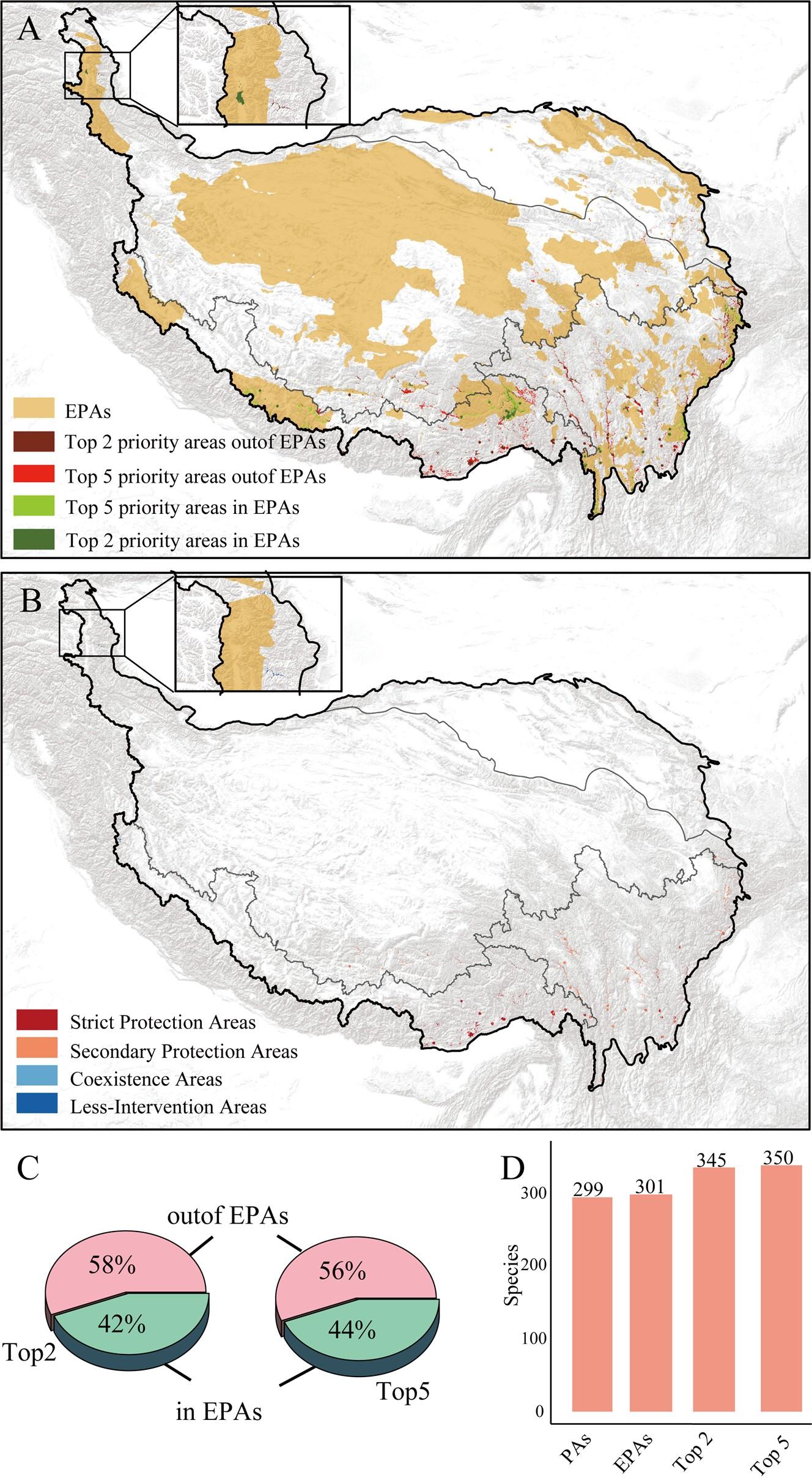 图3. 优先保护区域及其保护空缺状况。(A)当前气候条件下的优先保护区域与保护空缺;(B)前2%优先保护空缺及土地覆被保护类型;(C)扩展保护区内外优先保护区域分布;(D)不同保护区体系下的物种受保护数量。图A、B插图为青藏高原西北部低干预区域内零散分布的小型保护空缺。缩写说明:PAs(现有保护区)、EPAs(扩展保护区,含现有保护区及在建国家公园)、Top2(前2%优先区域扩展范围)、Top5(前5%优先区域扩展范围)。