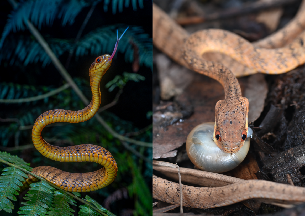 钝头蛇科蛇类专以蛞蝓和蜗牛为食,而这一取食策略伴随着多重挑战,包括如何从壳中摄取蜗牛、如何有效分解猎物分泌的大量黏液,以及如何在低脂摄入下维持能量代谢。为应对这些挑战,钝头蛇类演化出一系列特殊表型,如短小的吻部、左右不对称的下颌齿,以及具有特殊分泌功能的膨大下唇腺等,是研究动物食性特化背后遗传机制的理想对象。