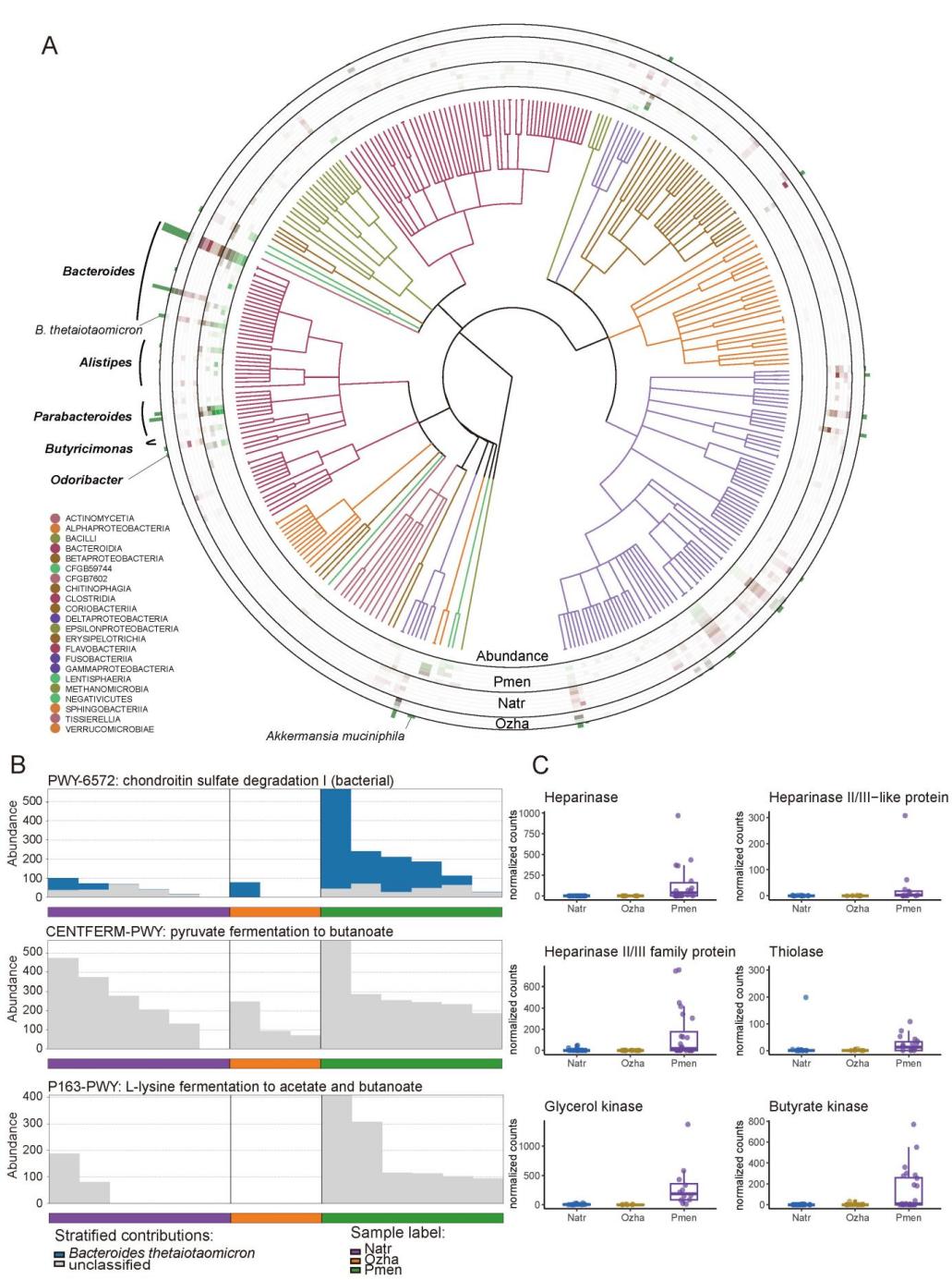 勐腊钝头蛇肠道微生物组成与功能也发生了适应性变化。相比于不吃蜗牛的蛇类,勐腊钝头蛇肠道中降解蜗牛黏液组分的细菌以及合成短链脂肪酸(short chain fatty acidSCFA)的细菌占有明显优势(图3)。有趣的是,与同样食物富含肝素类物质且脂肪含量极低的吸血蝙蝠(Desmodus rotundus)相似,勐腊钝头蛇的肠道中也富集了肝素裂解、短链脂肪酸合成及脂质合成相关的微生物酶。它们的肠道共生菌可利用肝素分解产生的低聚糖持续合成SCFA作为宿主的能量来源,并减轻脂质摄入不足的影响。