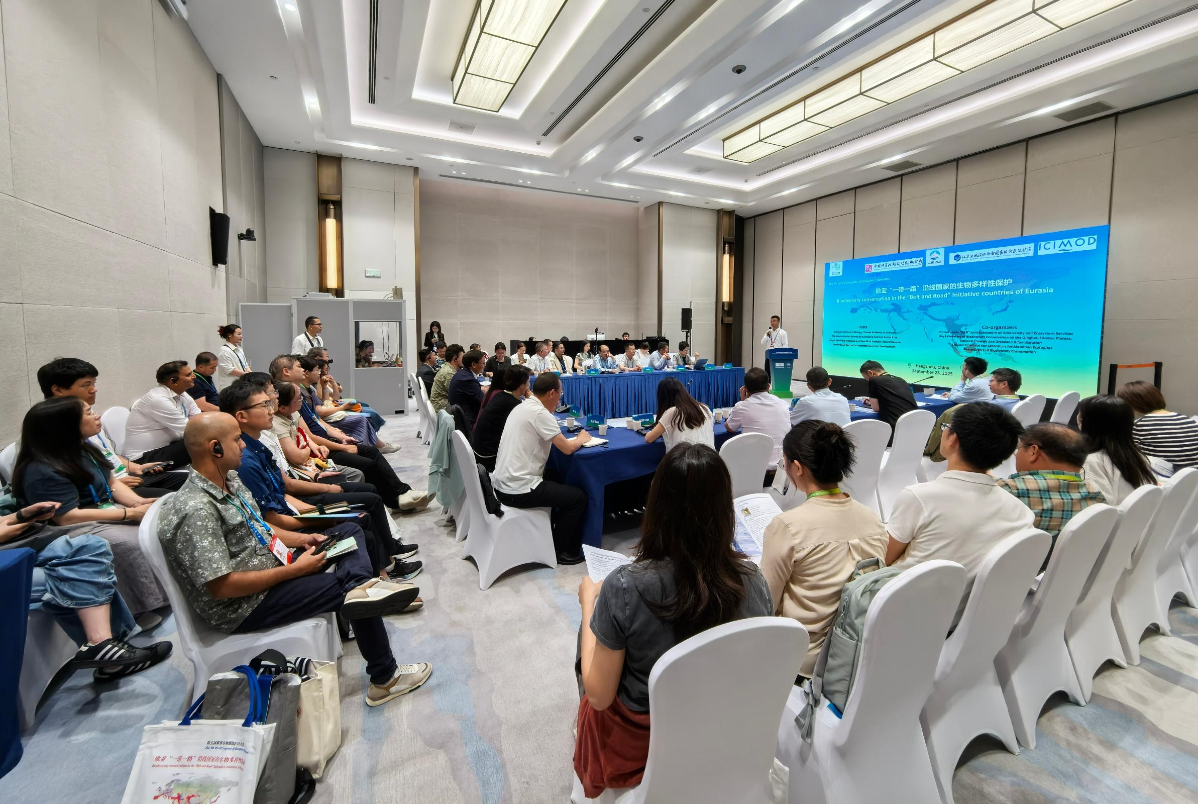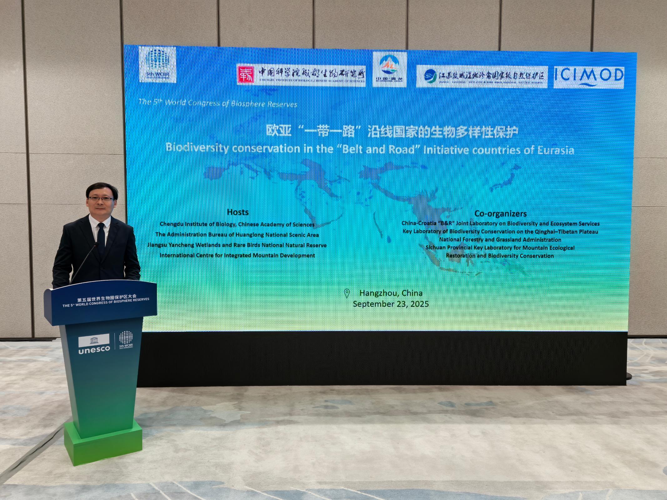 2025年9月23日,中国科学院成都生物研究所、黄龙国家级风景名胜区管理局、江苏盐城湿地珍禽国家级自然保护区、国际山地综合发展中心(ICIMOD)联合主办的第五届世界生物圈保护区大会边会-“欧亚‘一带一路’沿线国家的生物多样性保护”在杭州顺利召开,边会聚焦欧亚大陆生物多样性保护,旨在通过科学理论与经验共享,推动跨国科研协作和保护行动,为构建高水平生物多样性保护网络提供有力支撑。来自中国、克罗地亚、比利时、葡萄牙、伊朗、乌兹别克斯坦、尼泊尔、安哥拉等国家的约80名代表参会。