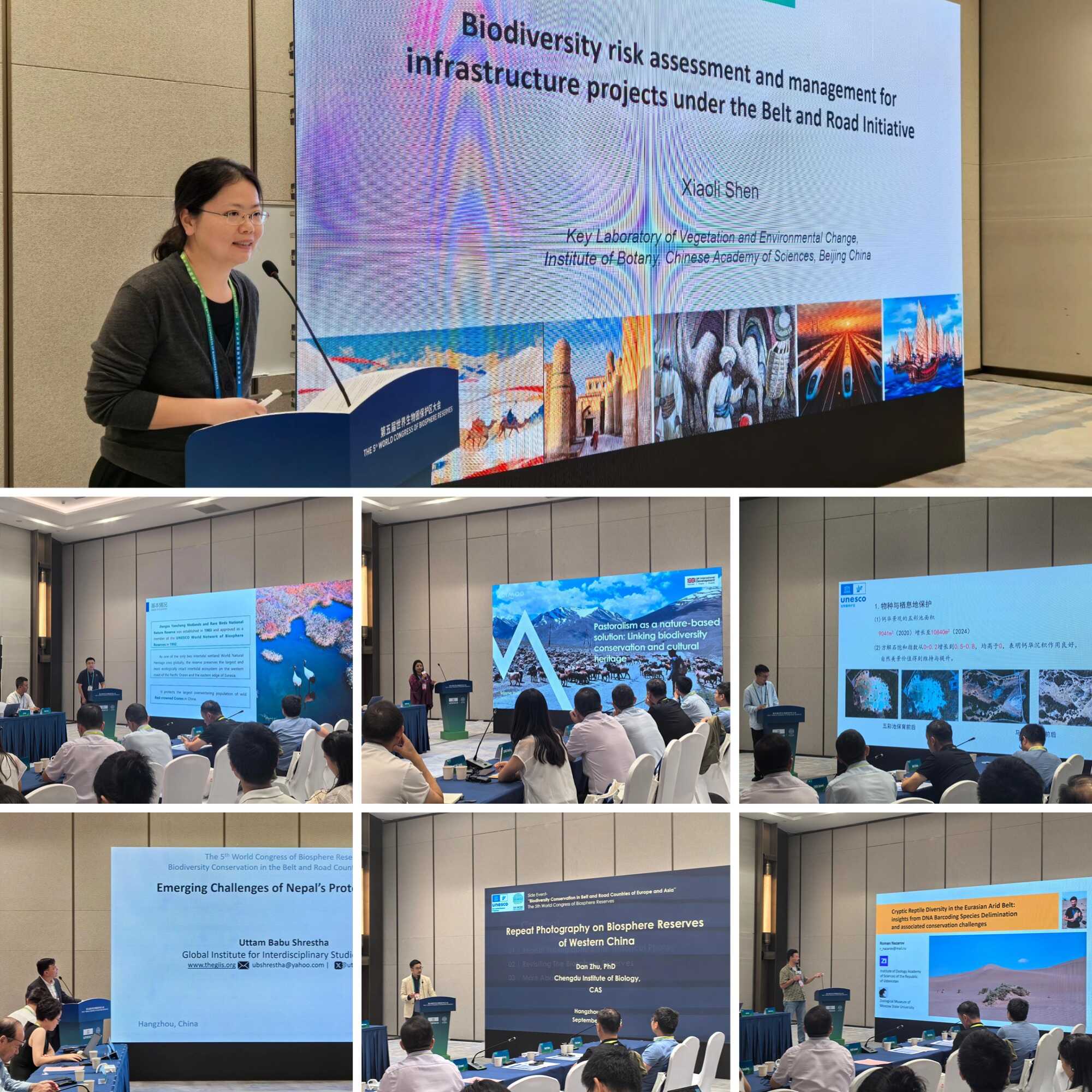 在专题报告环节,中国科学院植物研究所研究员申小莉、国际山地综合发展中心生态系统专家Srijana Joshi Rijal、黄龙国家级风景名胜区管理局科研处方泽全、全球跨学科研究学院主任Uttam Babu Shrestha、成都生物所副研究员朱单、乌兹别克斯坦共和国科学院研究员Roman Nazarov、江苏盐城国家级珍禽自然保护区管理处资源与调查监测科负责人李洪磊围绕生物多样性保护、文化与自然遗产的联系、生态保护方法以及区域性合作等主题分享报告。