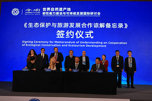 ?9月26日,由阿坝州人民政府主办、九寨沟世界遗产管理局承办、中国科学院成都生物研究所等支持举办的世界自然遗产地韧性能力建设与可持续发展国际研讨会在九寨沟成功召开。生物所所长吴宁参加会议,并代表成都生物所与九寨沟世界遗产管理局、克罗地亚萨格勒布大学理学院、普利特维采湖国家公园的代表共同签署了《生态保护与旅游发展合作谅解备忘录》。克罗地亚驻华大使达里欧·米海林(Dario Mihelin)、参赞碧塞拉·法布里欧(Bisera Fabrio),阿坝州委书记刘坪、州长罗振华共同为“中国-克罗地亚生物多样性和生态系统服务‘一带一路’联合实验室(筹)九寨沟科研基地”揭牌。来自国际组织、国内行业主管部门、地方政府、科研院所、知名高校、遗产地、5A景区、媒体代表200余人见证了签字和揭牌仪式。