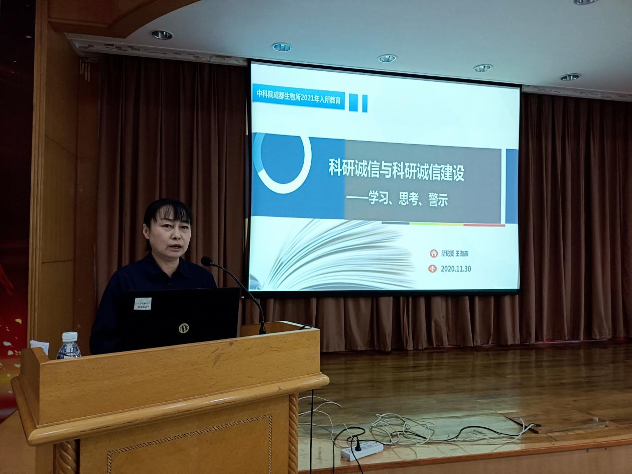 王海燕为新入所人员做了科研诚信专题培训,从学习、思考和警示三个方面层层深入地讲解了科研诚信的内涵,分析学术不端案例,介绍了我所老一辈科学家们的故事,警示大家一定要筑牢科研诚信的基石,做负责任的科研行为,切实担负起把我国建设成为现代化科技强国的历史使命。会上播放“青山为证奉献一生-追记著名植物生态学家刘照光”纪录片,回顾了刘照光先生奉献的的一生,他舍弃小家,为四川省建设长江生态屏障事业直到生命的最后一刻,为大家上了一堂生动的教育课。