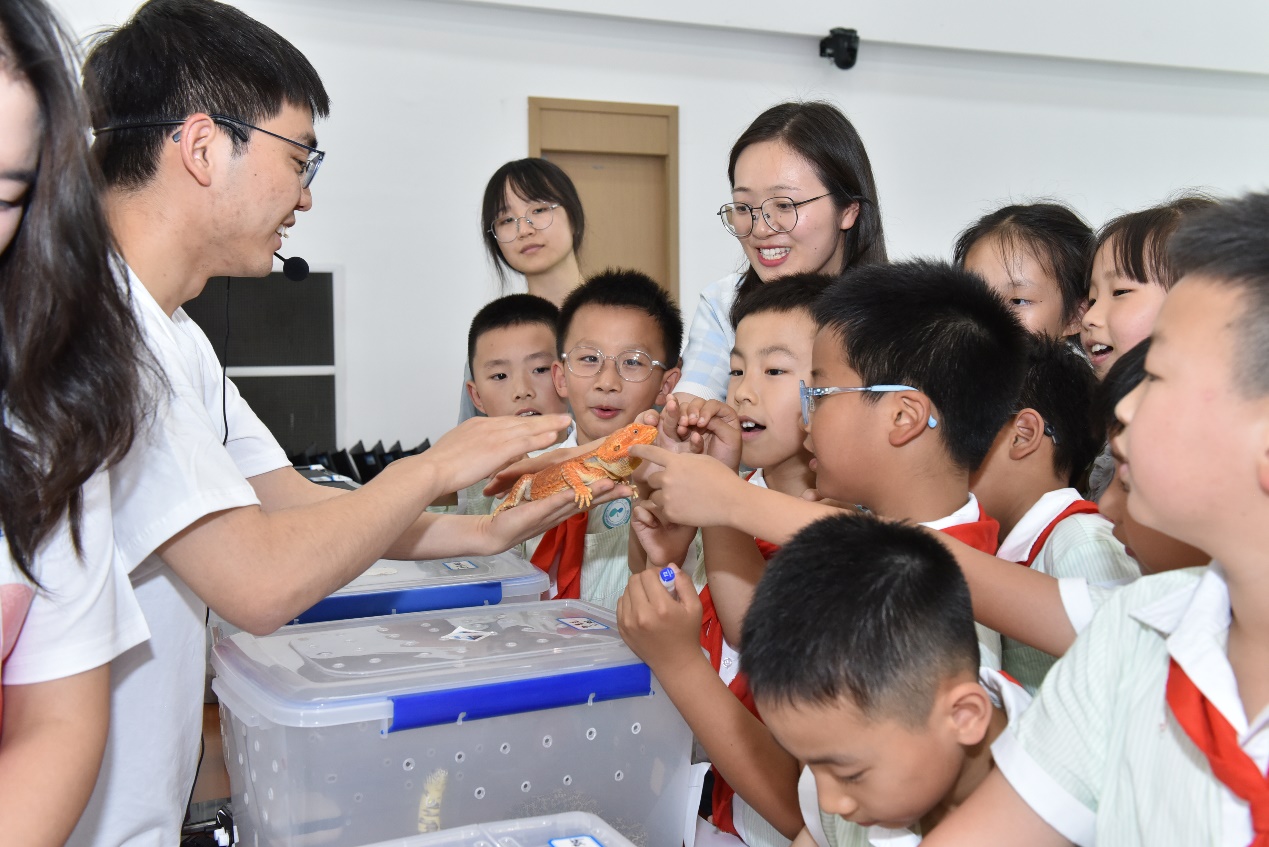 在两栖爬行动物展区,两栖爬行动物科普馆的工作人员和志愿者准备了包括鬃狮蜥、玉米蛇在内的多种活体两栖爬行动物,以及成都壁虎等动物标本。大小朋友对各类活体动物感到十分新奇,纷纷凑上前去仔细观察,亲手体验。同学们纷纷感言保护动物保护珍贵生态系统从我做起。