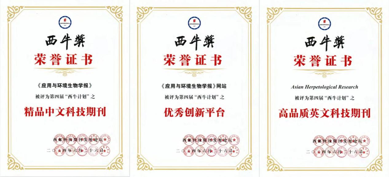 近日,由重庆、甘肃、四川等十省市区科技期刊编辑学会联合主办的第11届西部科技期刊发展论坛在甘肃敦煌召开,本次论坛发布了2024年度“西牛计划”入选项目。由中国科学院成都生物研究所主办的科技期刊《应用与环境生物学报》获评第四届“西牛计划”之精品中文科技期刊,Asian Herpetological Research获评第四届“西牛计划”之高品质英文科技期刊,《应用与环境生物学报》网站获评第四届“西牛计划”之优秀创新平台。