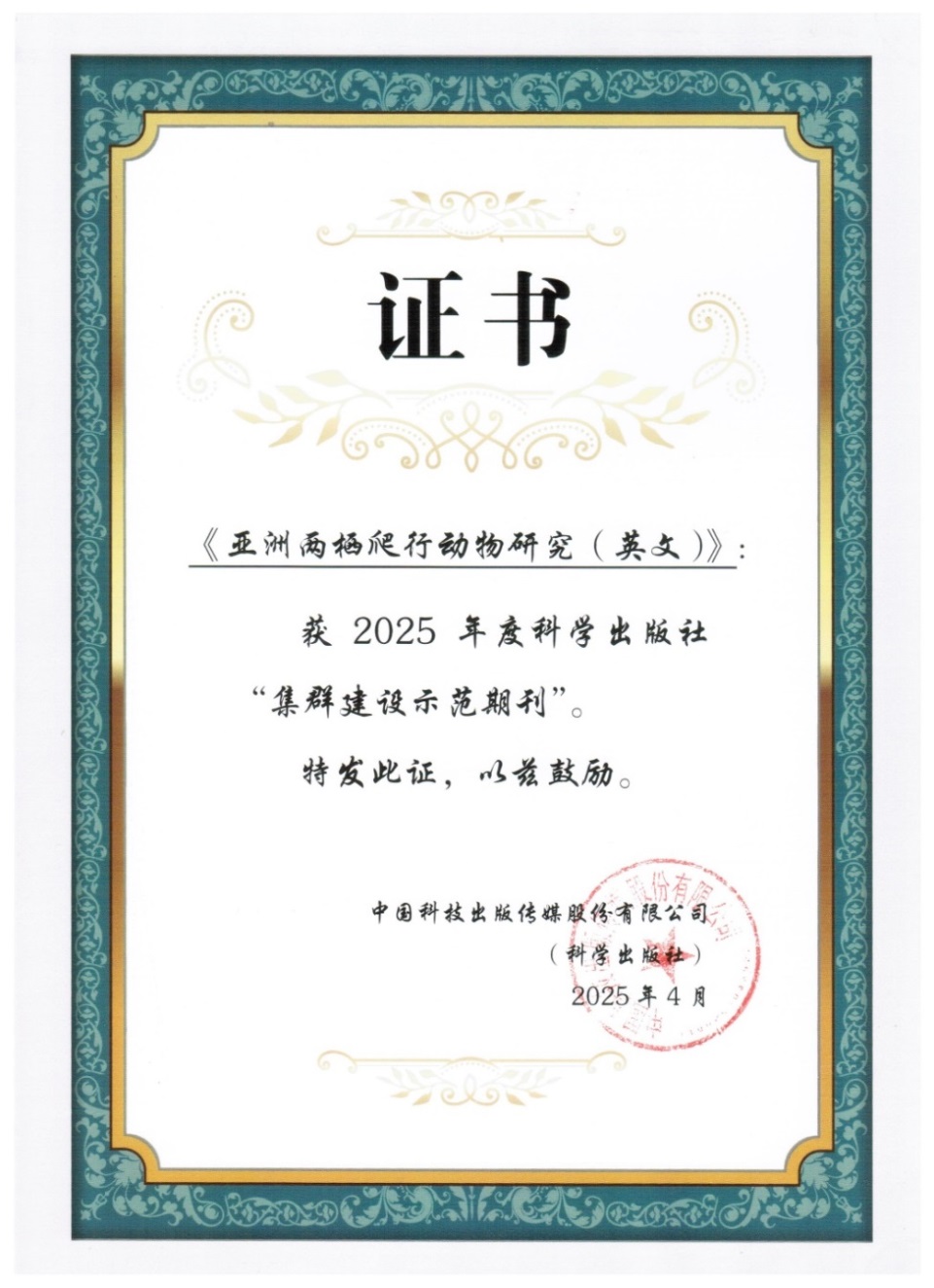 近日,成都生物所主办期刊《亚洲两栖爬行动物研究(英文)》入选科学出版社“集群建设示范期刊”。颁奖仪式于4月22日在2025年科学出版社期刊出版年会期间举行。